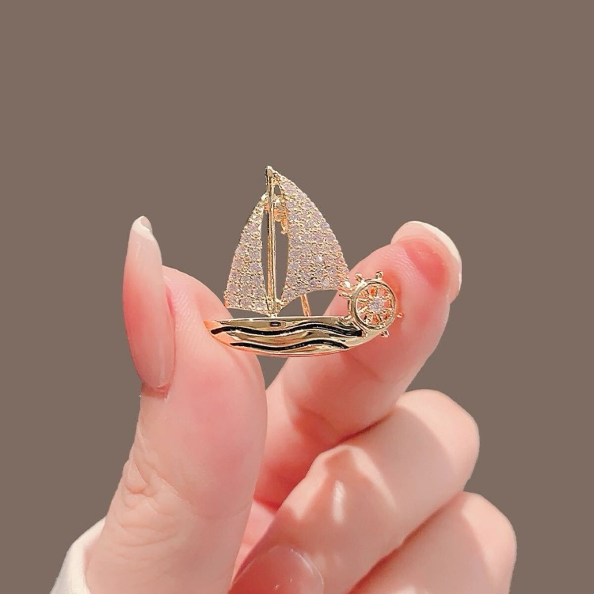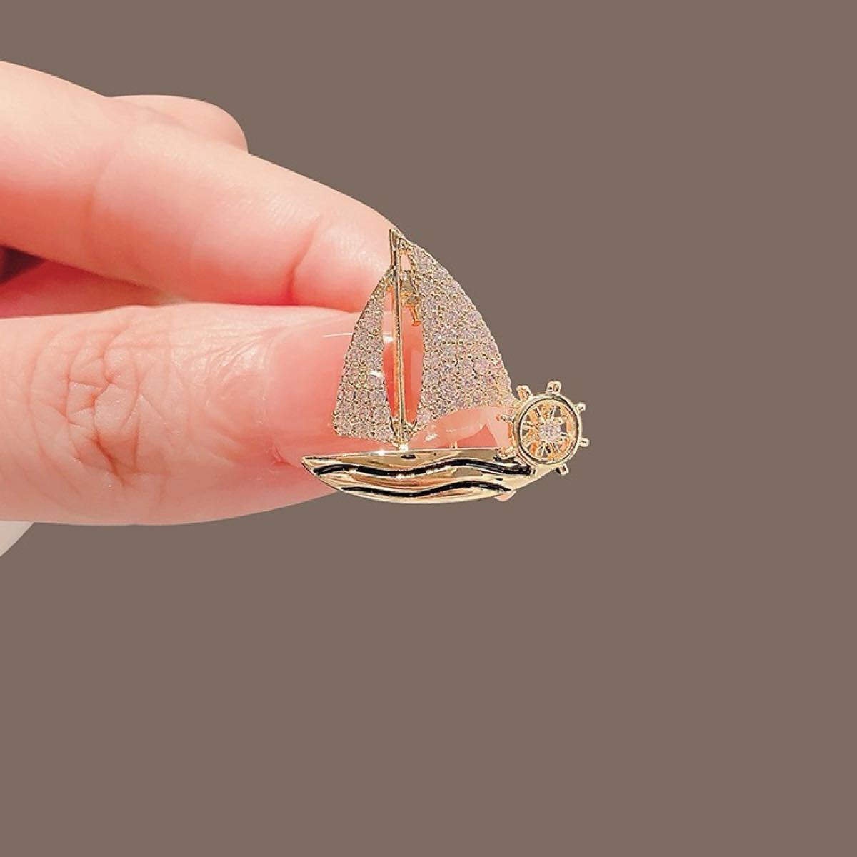 金属製のゴールド帆船ブローチ、ラメ入りの帆が特徴。