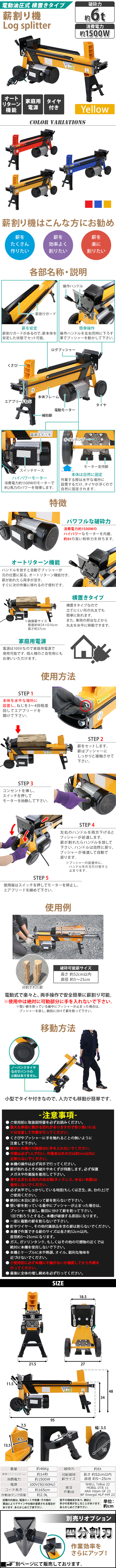| 商品名 | 送料無料 電動薪割り機 薪割り機 ログスプリッター 電動 油圧 破砕力約6t 最大対応薪サイズ直径約25cm長さ約52cm 消費電力約1500W 電源100V モーター 強力 小型 イエロー 薪割機 横割り カッター 薪ストーブ 家庭用 業務用 斧 薪 破砕 木 木材 原木 丸太 黄 logst6t2yl |