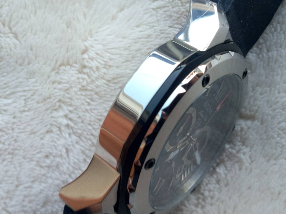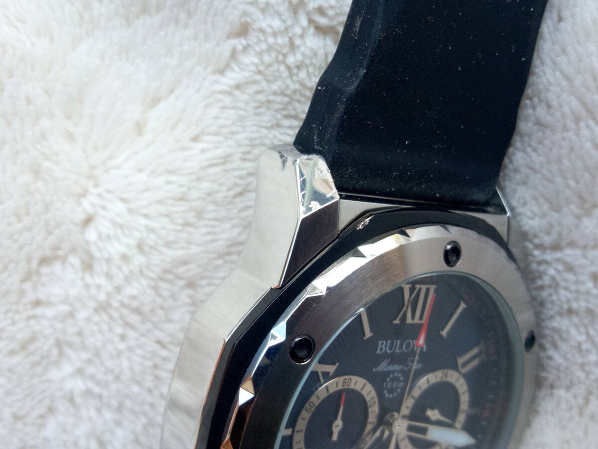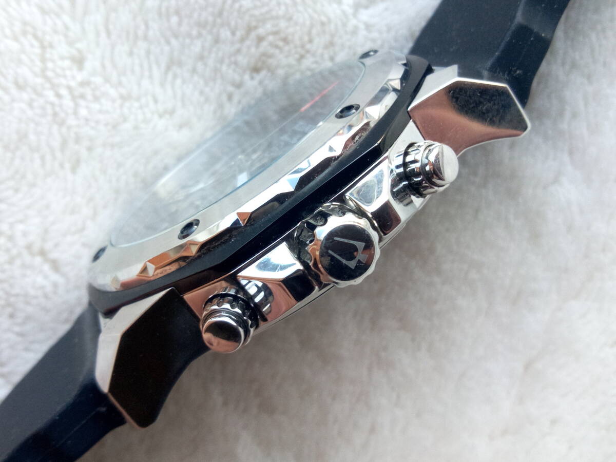 左上ラグ先端にやや打ち傷があります。ガラスはきれい。ベゼルケースも薄い擦れ傷程度できれいです。稼働正常でクロノ機能他問題なし。