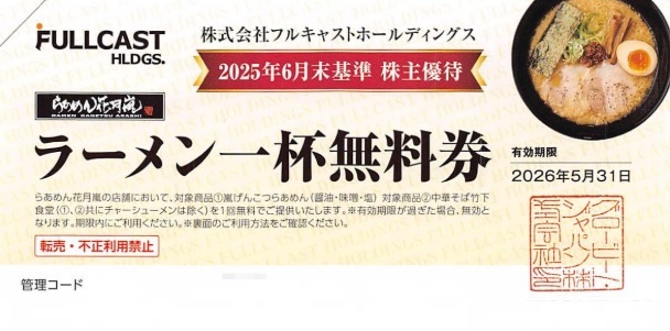 フルキャストホールディングス株主優待の「らあめん花月嵐」の「ラーメン一杯無料券 12枚セット」です。