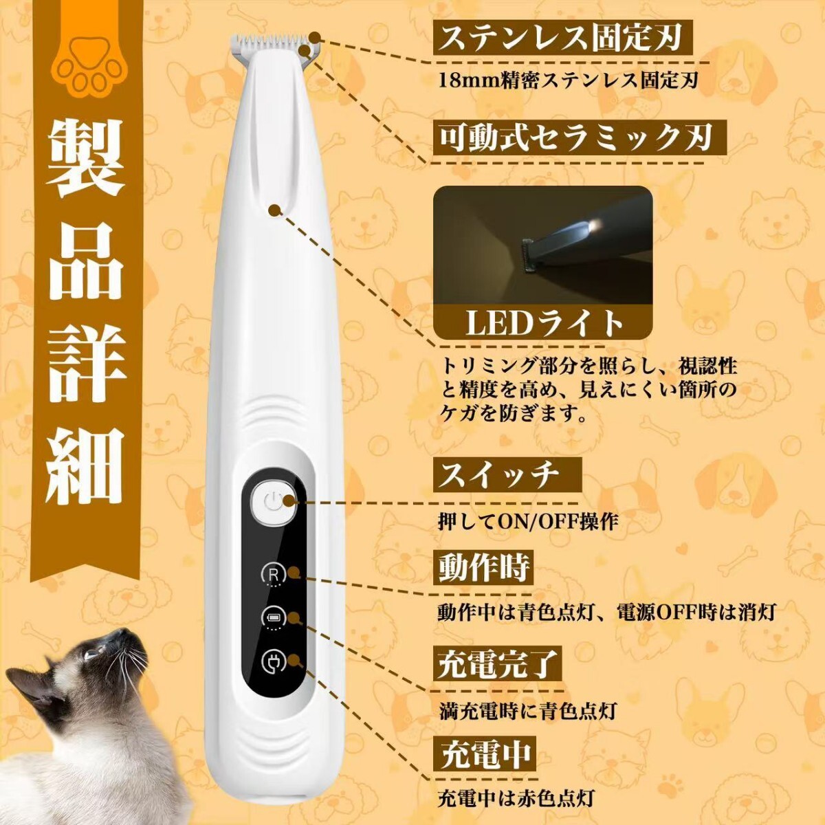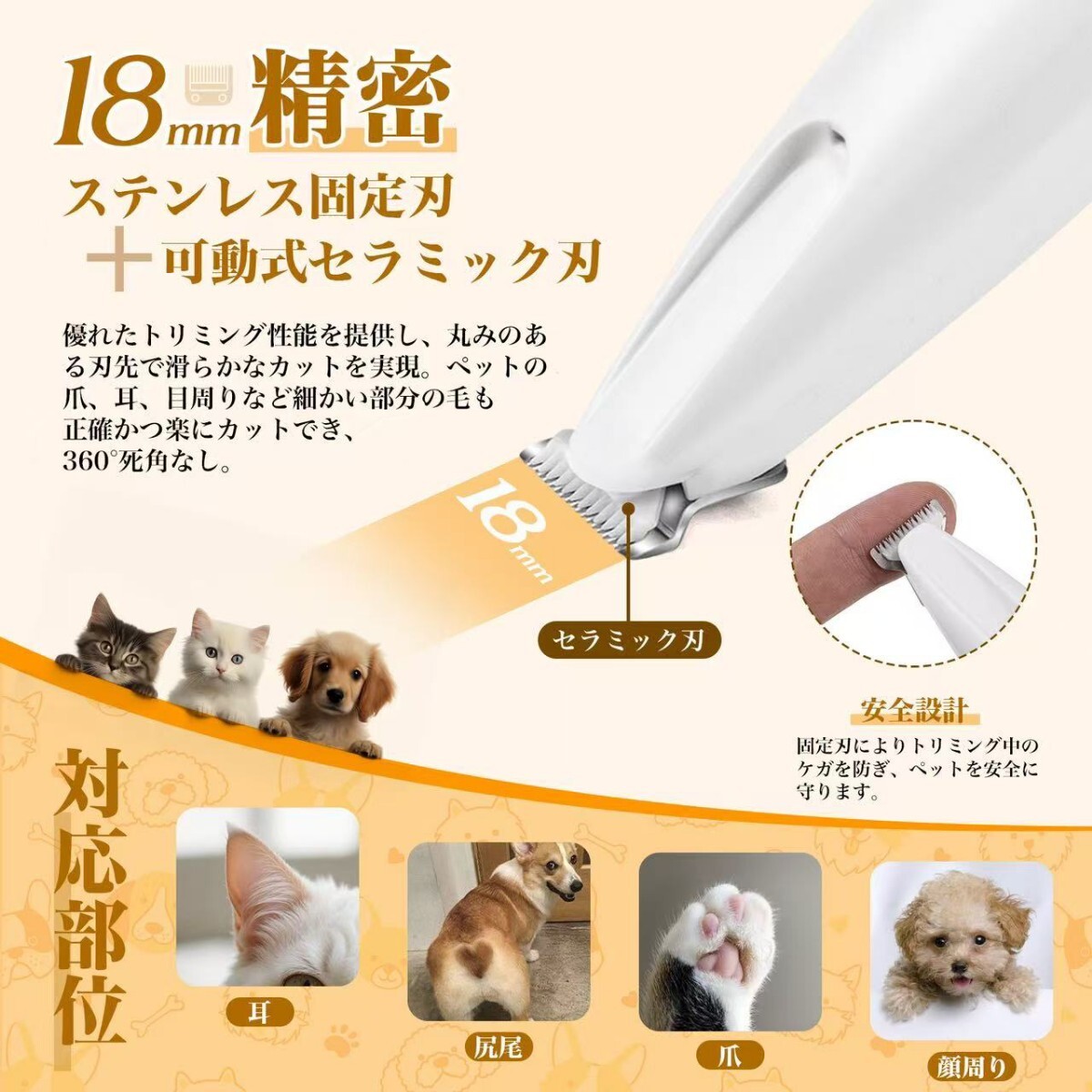 1.【安全設計と精密なトリミング】このペット用トリマーは、安全なR型刃を採用しており、ペットの敏感な部分(目、耳、足の間など)を傷つける心配がありません。刃幅は小さく、狭い隙間にも簡単にアクセスでき、細かい部分まで丁寧にトリミングできます。猫や小型犬に最適です。