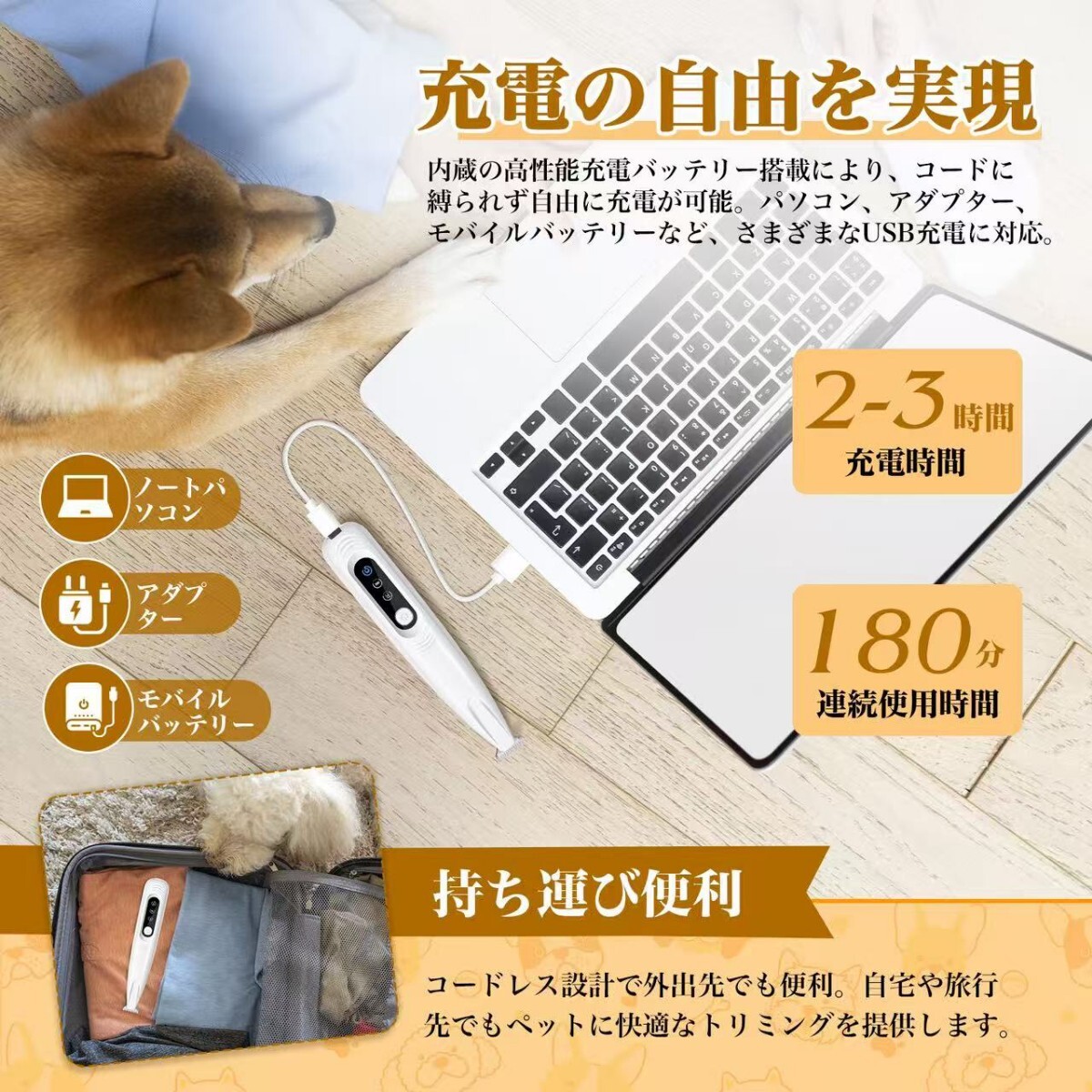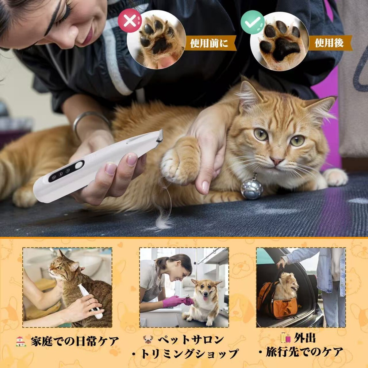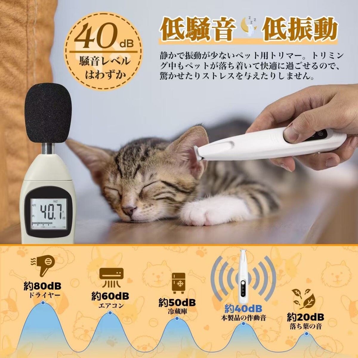 3.【低騒音・低振動設計でペットもリラックス】静音設計と低振動技術を採用しており、ペットがトリミング中に恐怖や不安を感じることなくリラックスして過ごせます。音に敏感なペットに最適で、ストレスを最小限に抑えます。