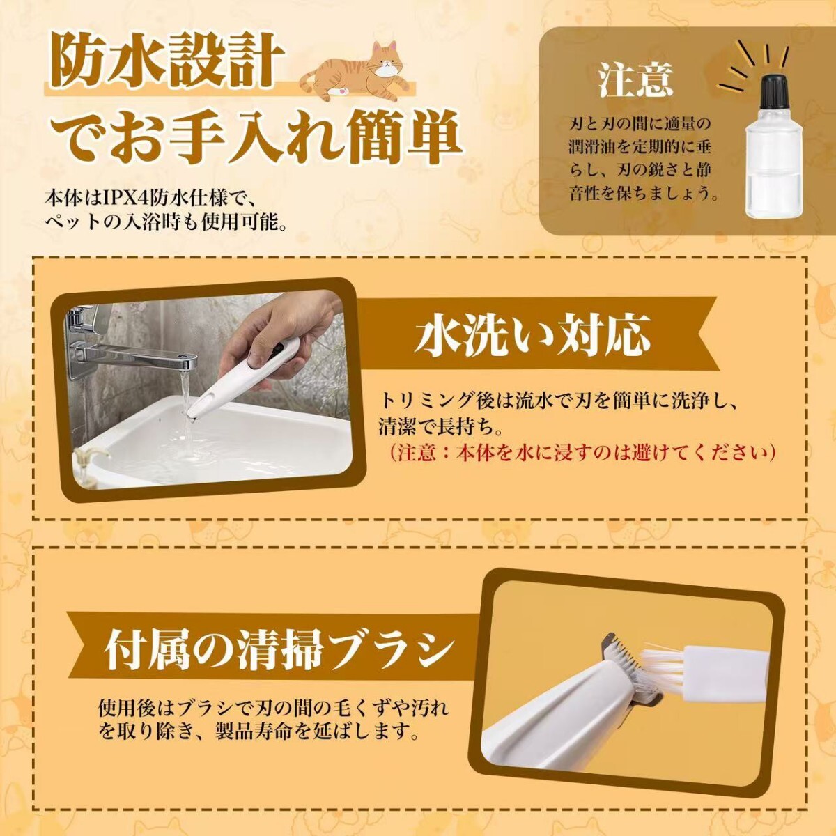 5.【防水設計でお手入れ簡単】防水機能を備えており、トリマーを流水で洗うことができます。毛が詰まる心配がなく、毎回清潔に保つことができるので、長期間安心して使用できます。使い終わった後のメンテナンスも簡単です。