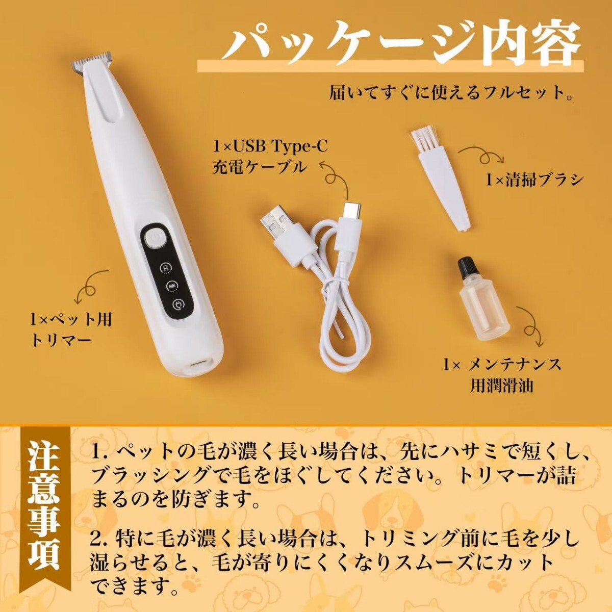- 付属品: USB充電ケーブル、オイル、ブラシ