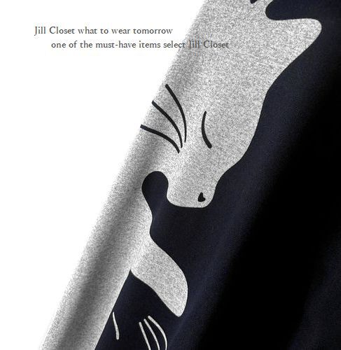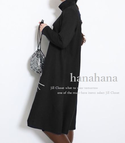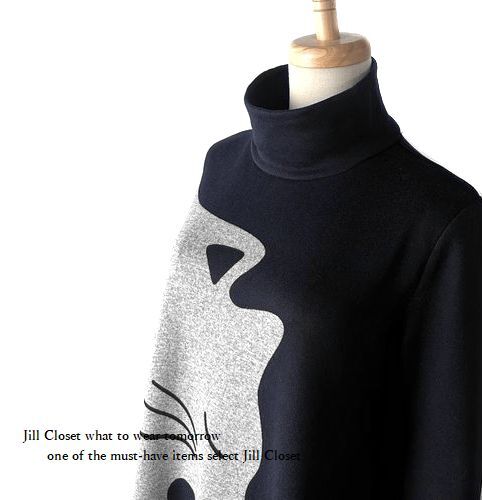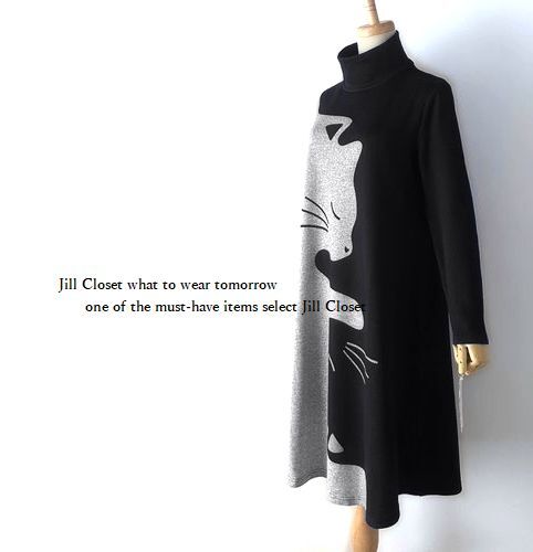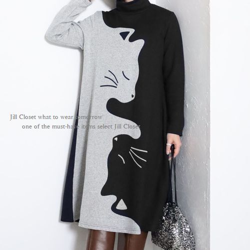 新品*BLACK【送料185円】伸縮◎遊び心あふれる猫ちゃんpt*裏薄起毛 プルオーバー*ワンピース*リラクシーなオフタートルネック♪7755