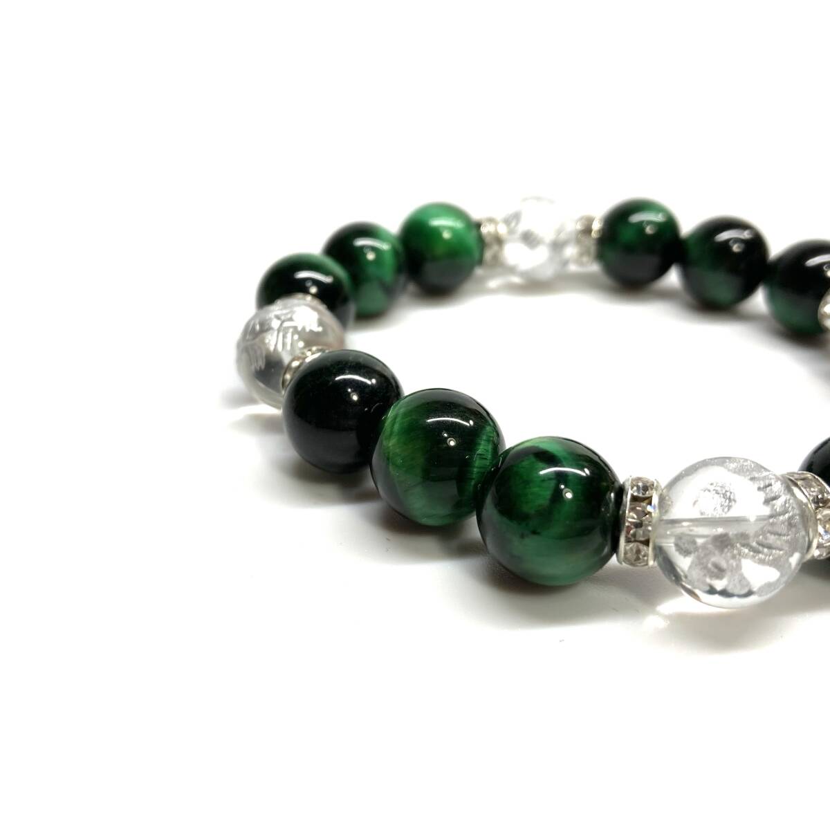 四神獣銀彫水晶×グリーンタイガーアイ 12mm パワーストーン ブレスレット天然石 青龍 白虎 玄武 朱雀 運気上昇 お守り 四神獸 四神相応 S