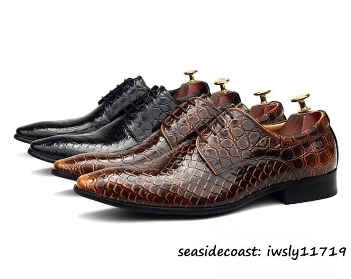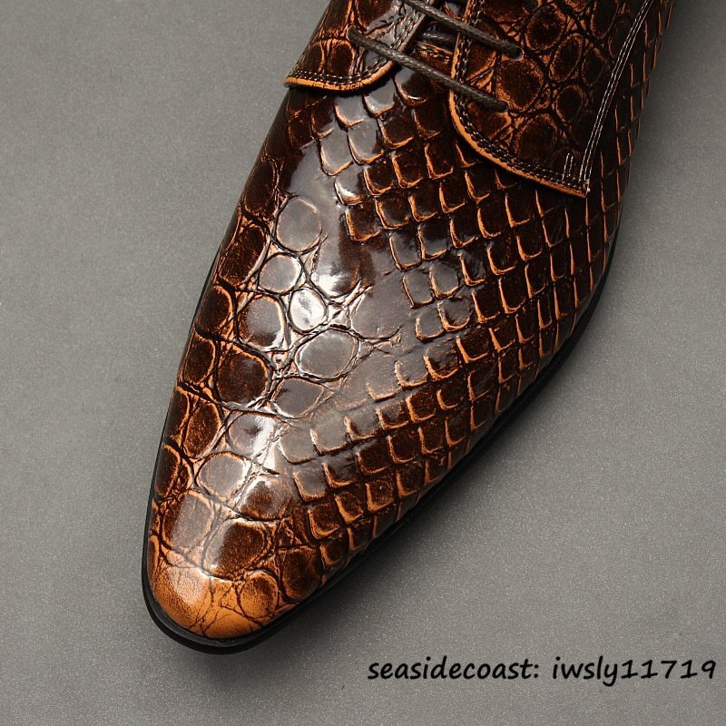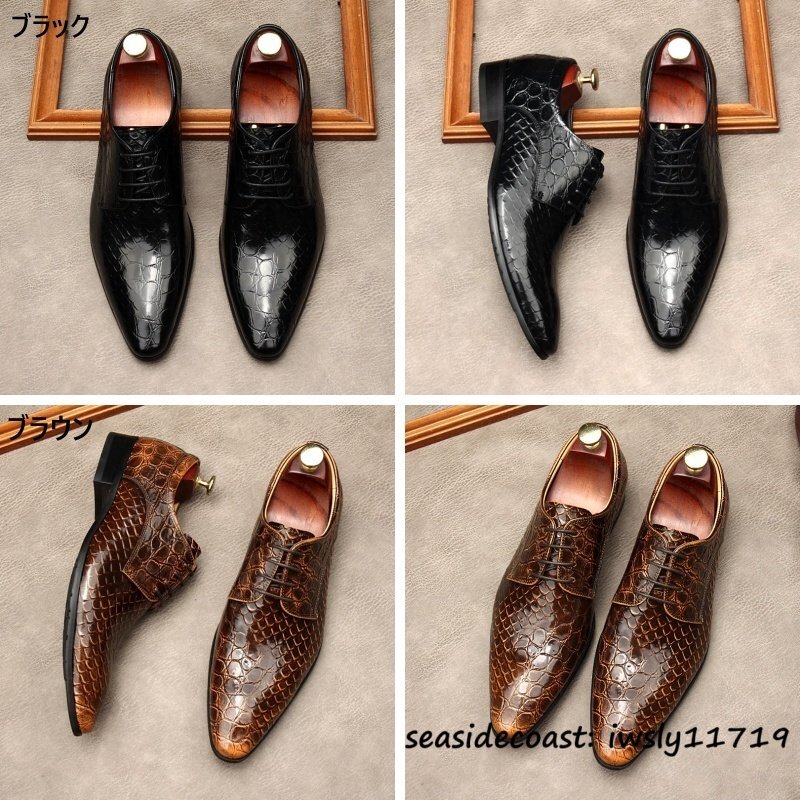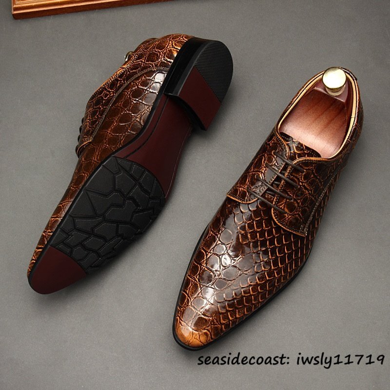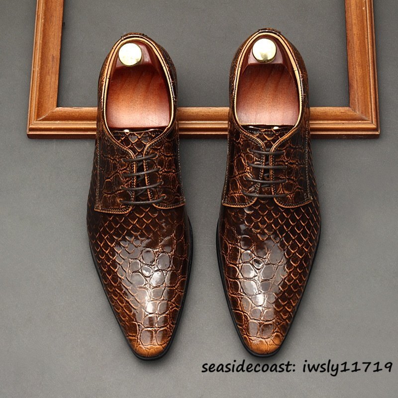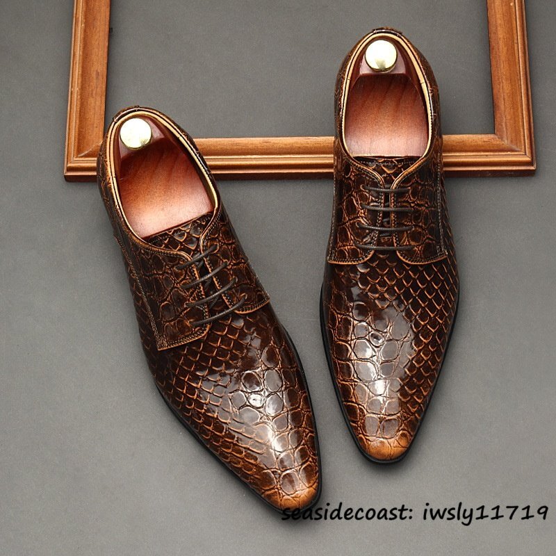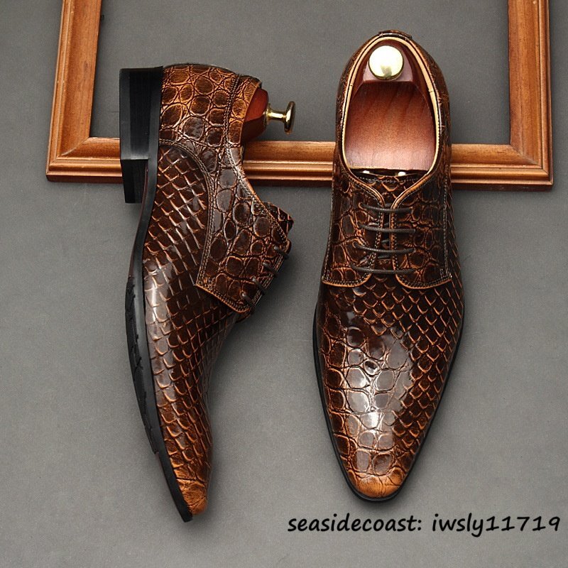 定価10万超★最高級 メンズ ビジネスシューズ 鰐柄 本革 レザーシューズ 牛革 イギリス風 職人手作り 紳士靴 革靴 結婚式 ブラウン 26.5cm