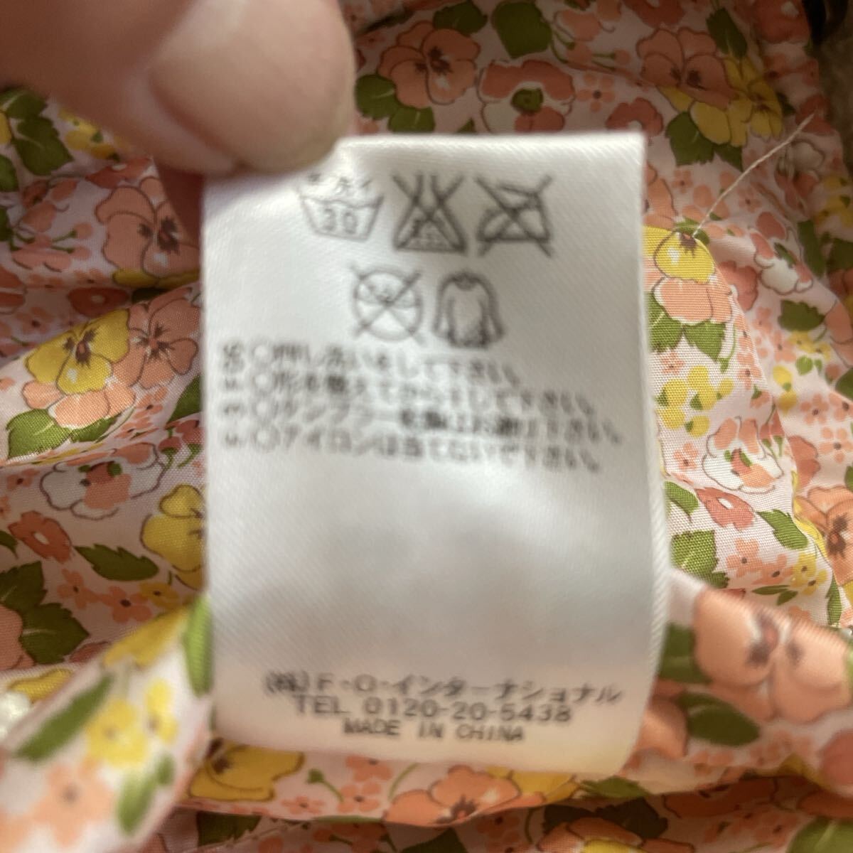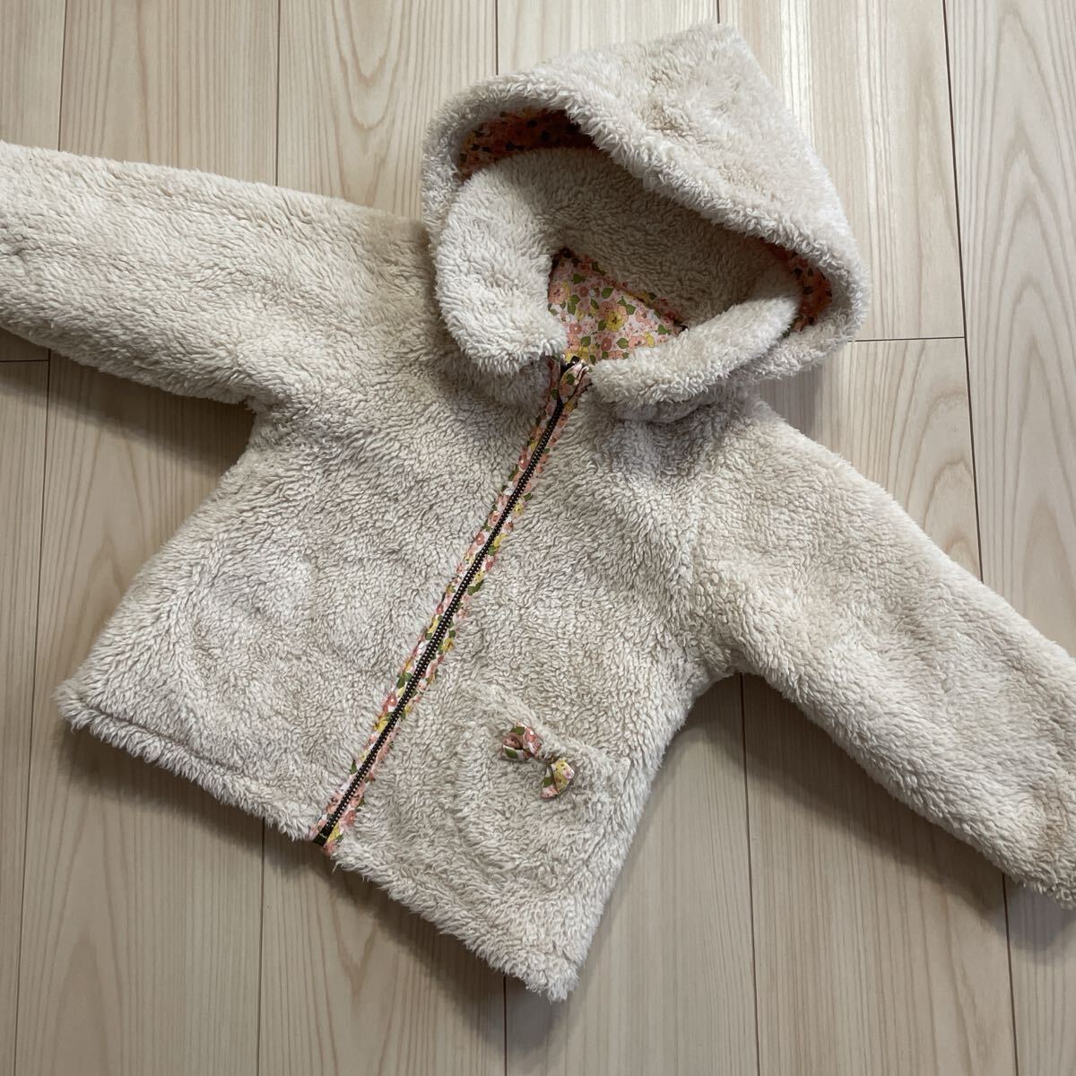 商品:細かいお花柄のツルツルした生地と、ベージュ色のフリース生地のリバーシブルのジャンバーです。フードの取り外しができるお品物です。