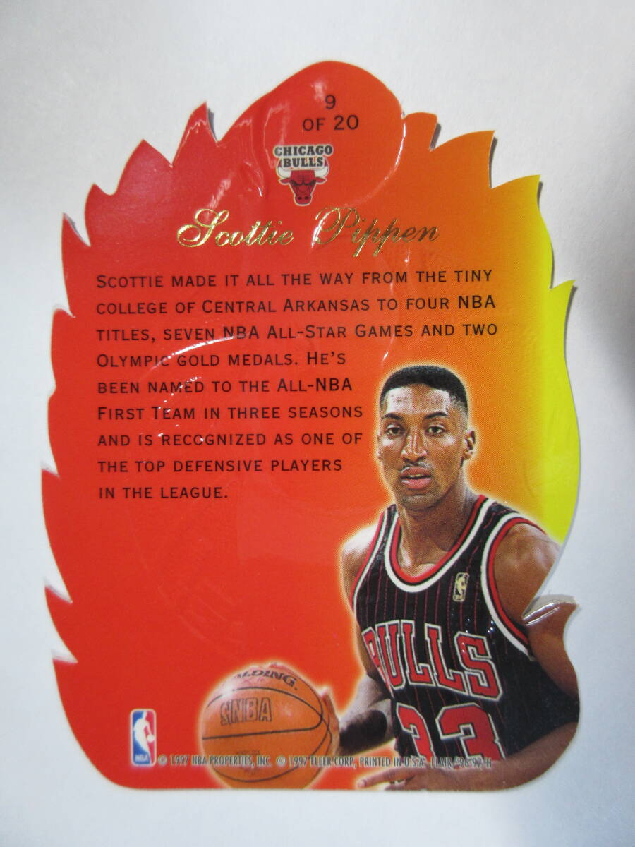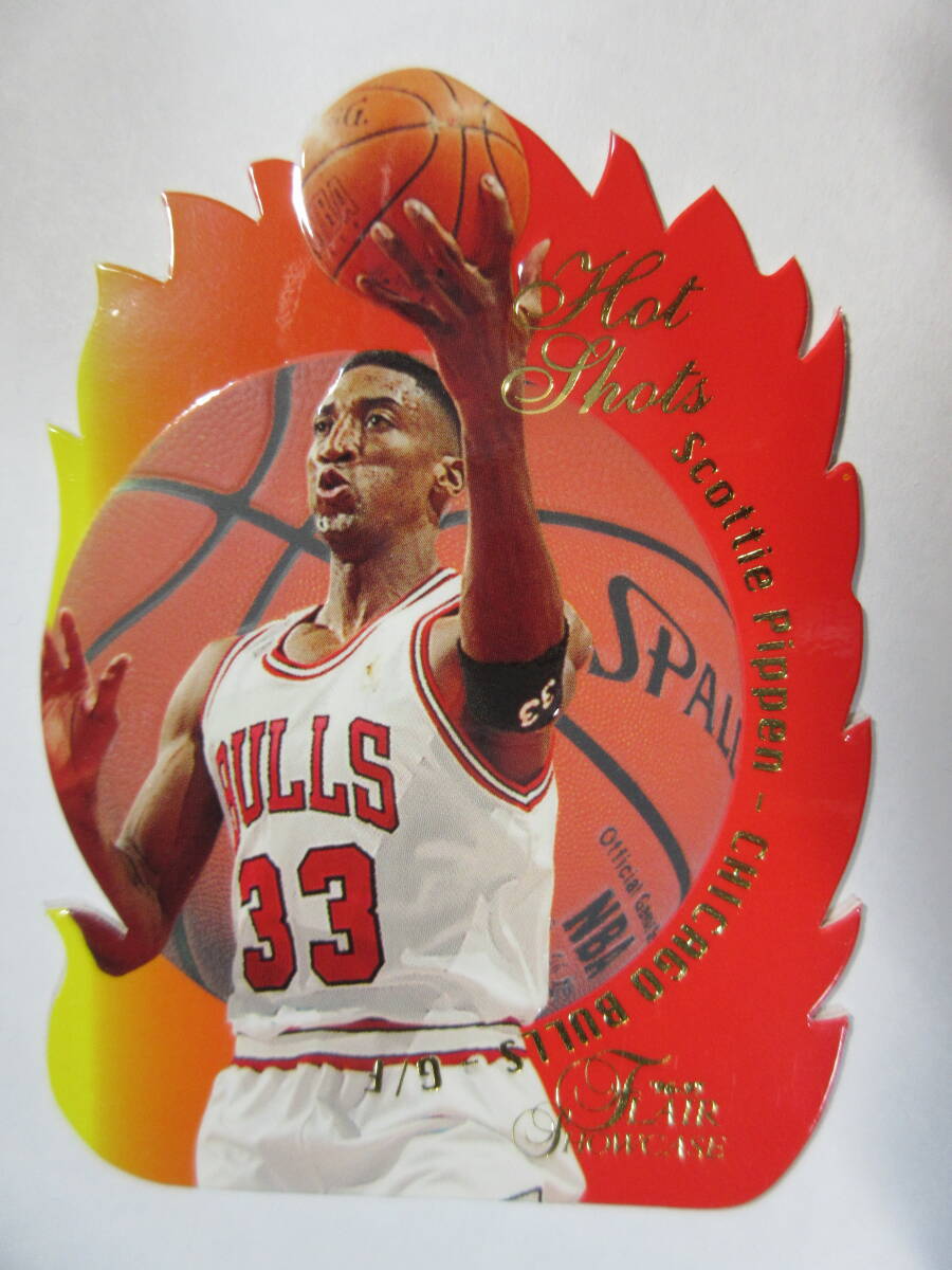 Fleer社発行の、「1996-97 Flair Showcase basketball」に封入されていた、1987年ドラフト1巡目(全体5位)でシアトル・スーパーソニックスから指名を受けるもブルズにトレード、攻守にわたりバランスの取れたオールラウンダーであり、史上最高のスモールフォワードの一人と考えられており、1990年代6度優勝したブルズの中心選手でもあり、マイケル・ジョーダン選手と共に1990年代にNBAを世界中に普及させることに貢献した一人であり、2010年バスケットボール殿堂入りを果たしたスコッティ・ピッペン元NBA選手、人気で貴重なインサートカードの一枚、ダイカット加工の「Hot Shots」カードです。