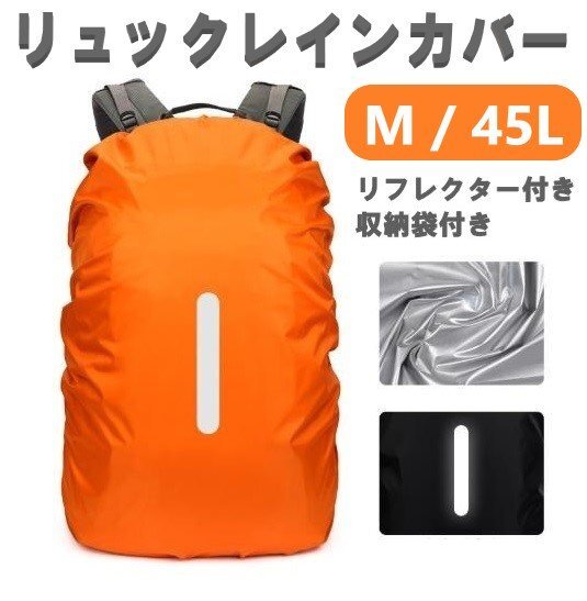 レインカバー オレンジ Mサイズ 45L 落下防止バンド付き 収納ポーチ付き リュックカバー ザックカバー 防水 雨 雨用 バッグ