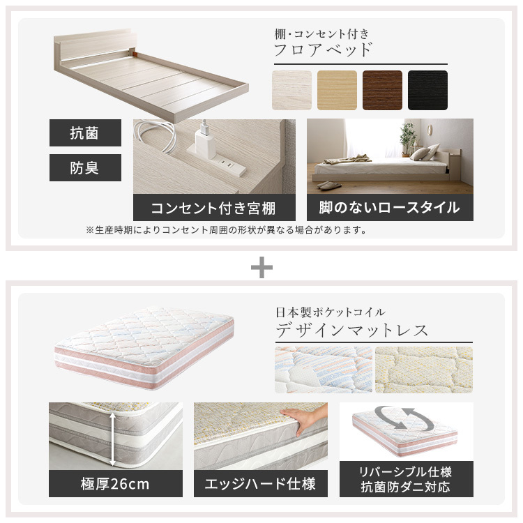 デザインフロアベッド 日本製ポケットコイルデザインマットレスセット(シングル) ホワイトオーク/オレンジ×ブルー