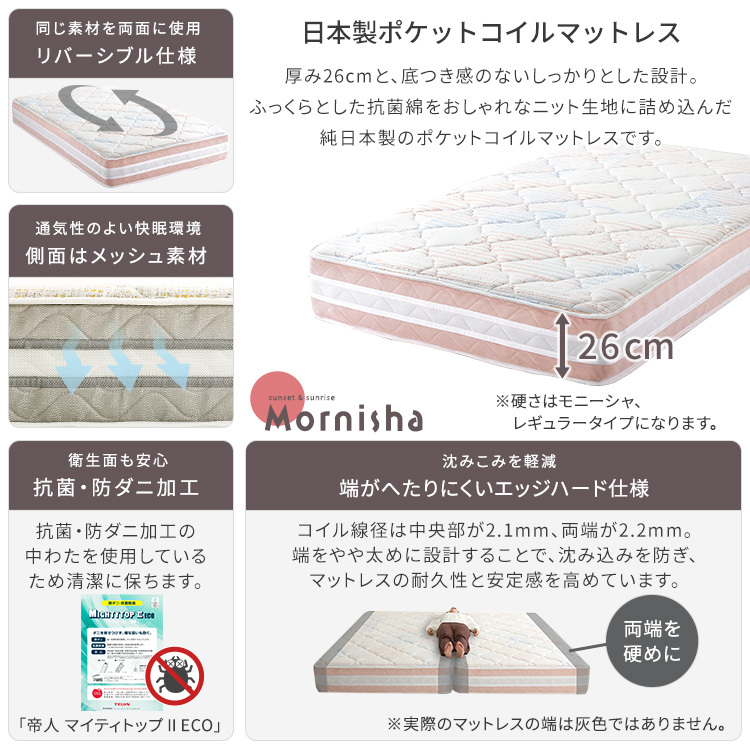 マット中材:ポケットコイル、ウレタン、不織布、防ダニ抗菌綿
