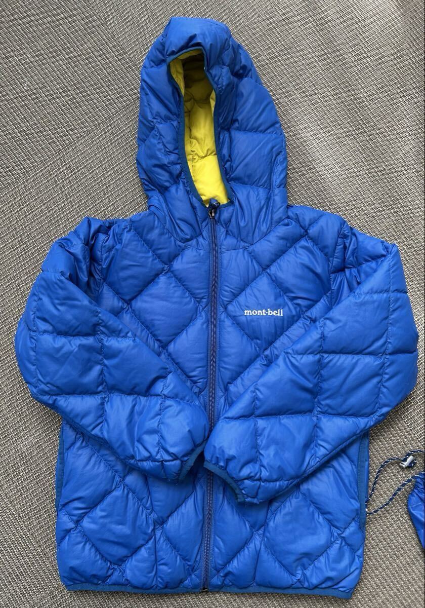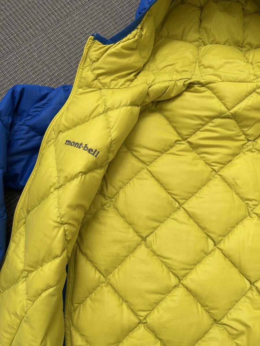 mont-bellのキッズ用インナーダウンジャケットです。鮮やかなブルーとイエローのリバーシブルデザインで、軽量ながらも暖かく、アウターとしてもインナーとしても活躍します。