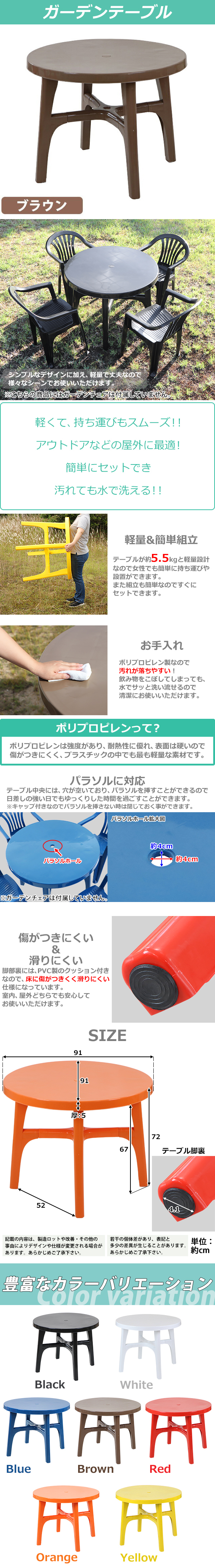| 商品名 | 送料無料 ガーデンテーブル ポリプロピレン製 PP ブラウン 軽量で持ち運び簡単 ガーデンファニチャー ガーデン テーブル アウトドア アウトドアテーブル おしゃれ パラソル使用可 屋外用 庭 テラス バルコニー 丸型 円形 ラウンド プラスチック deckchairtablebr |