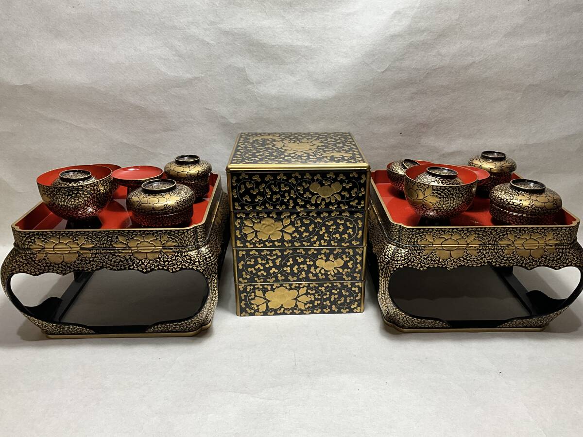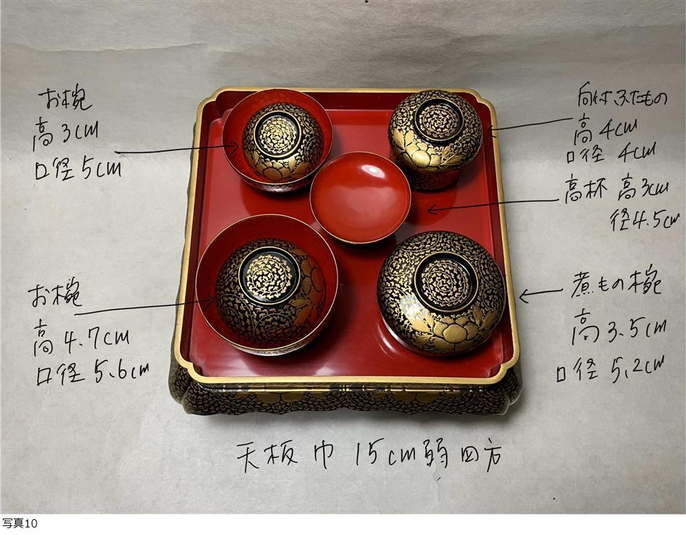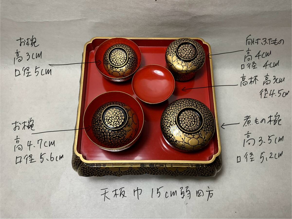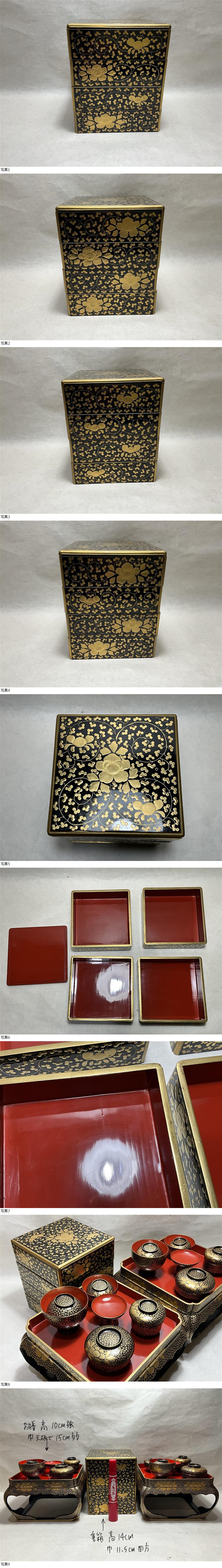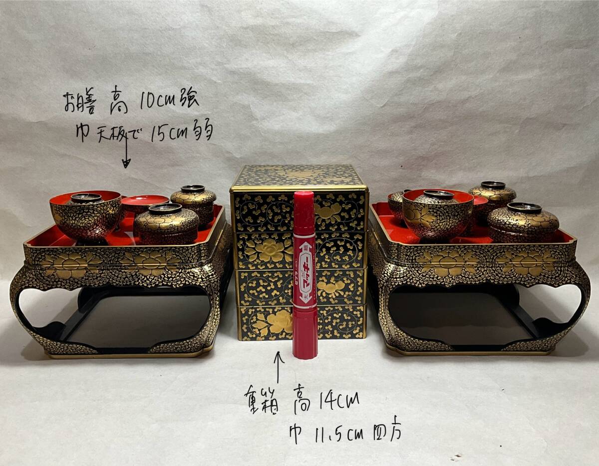 大きさは画像を参考にして下さい。大正昭和初期頃の金蒔絵の雛道具です。重箱の共箱はありません。