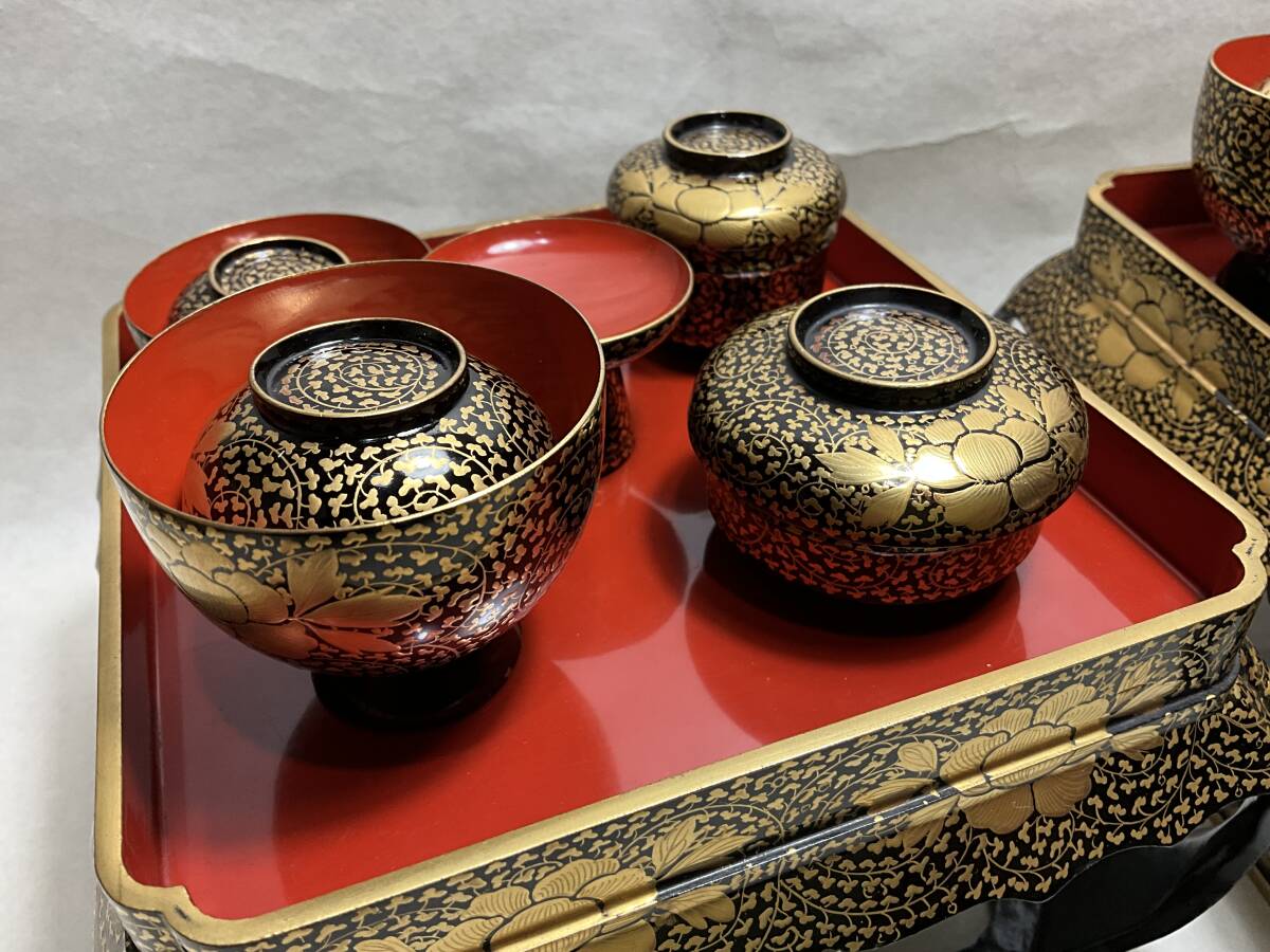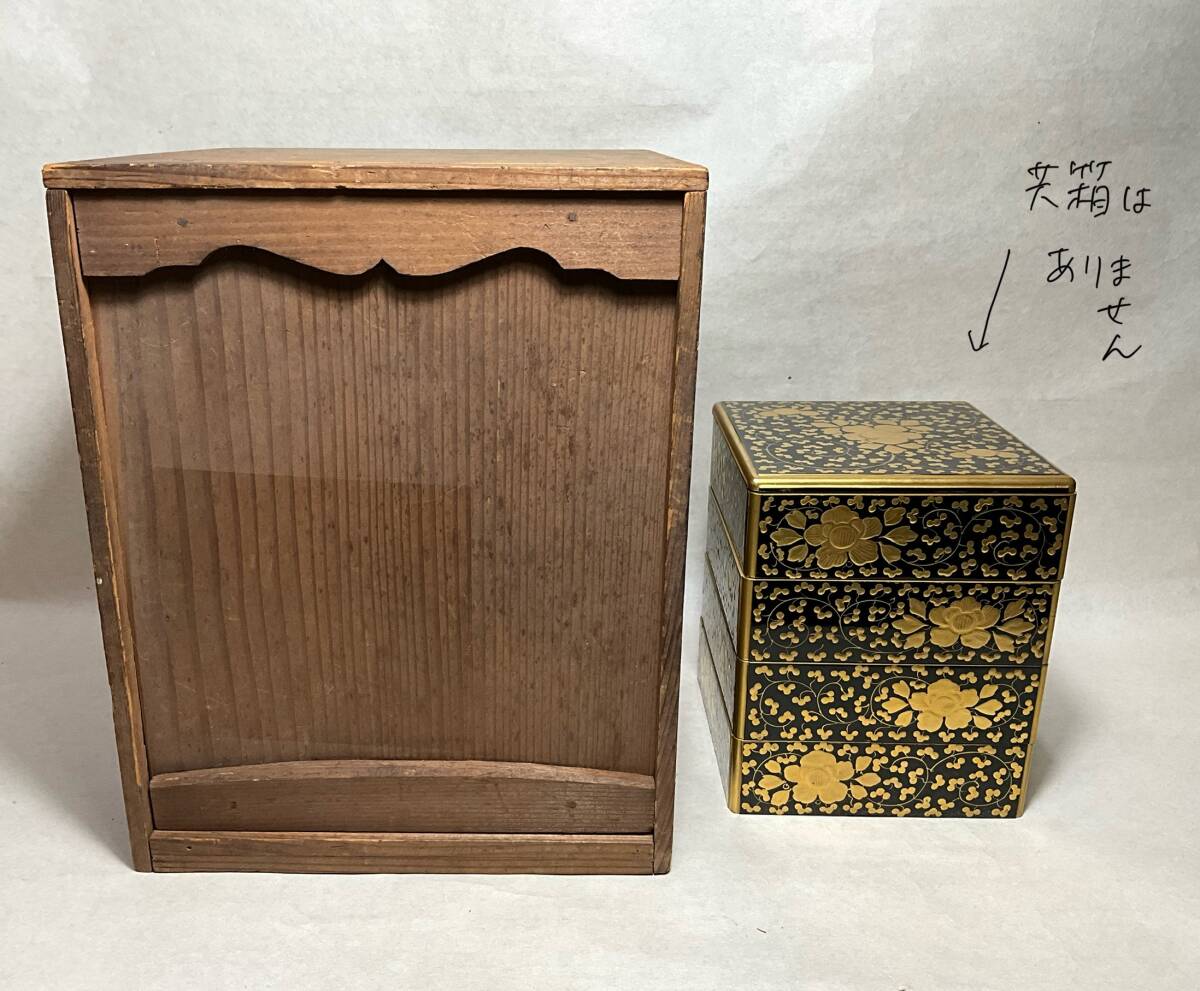 ヤケ、汚れ、蒔絵のスレなど、時代のダメージはあります。重箱の内側に浮き上がった場所があります。(画像を参考にして下さい)