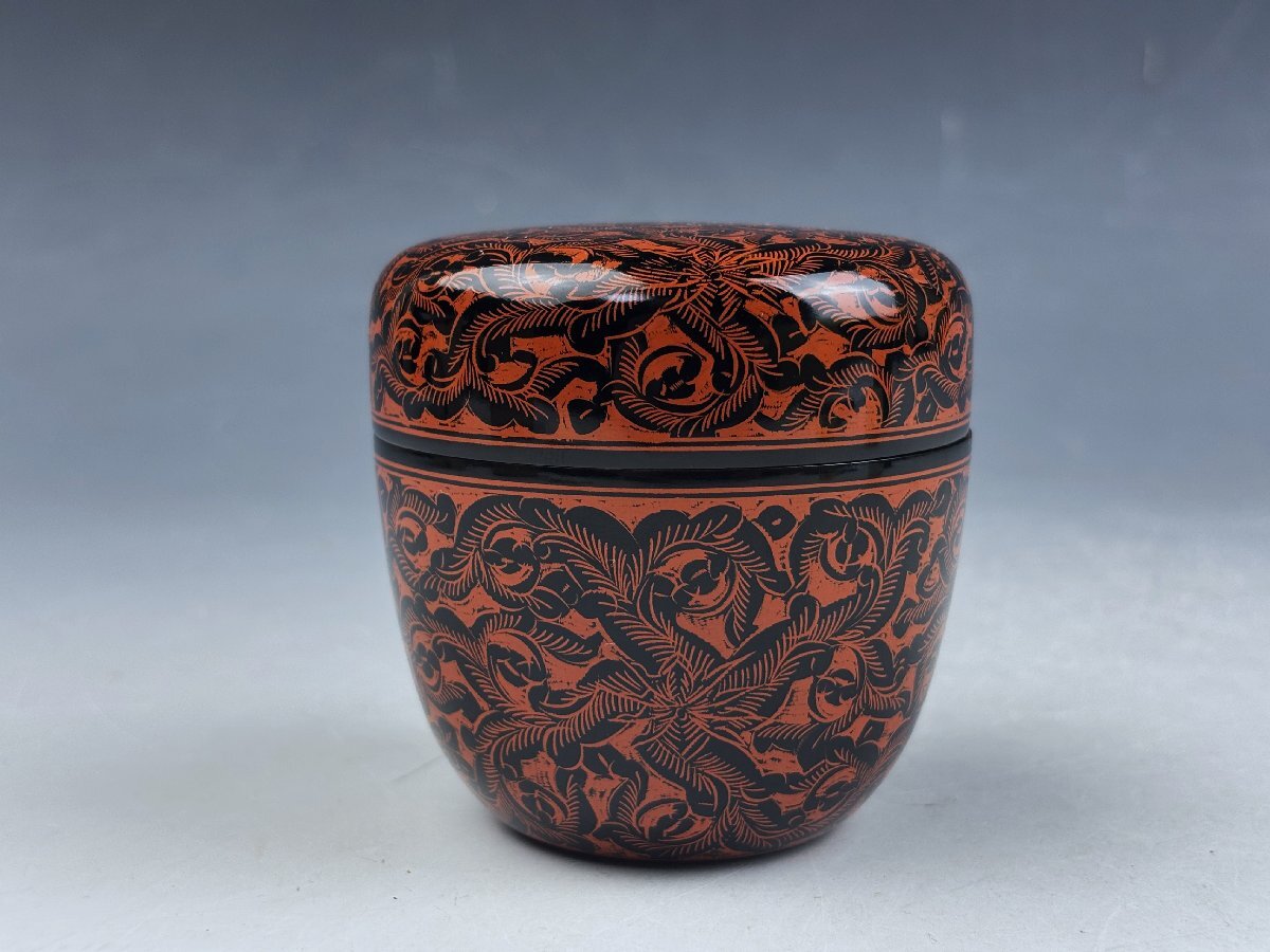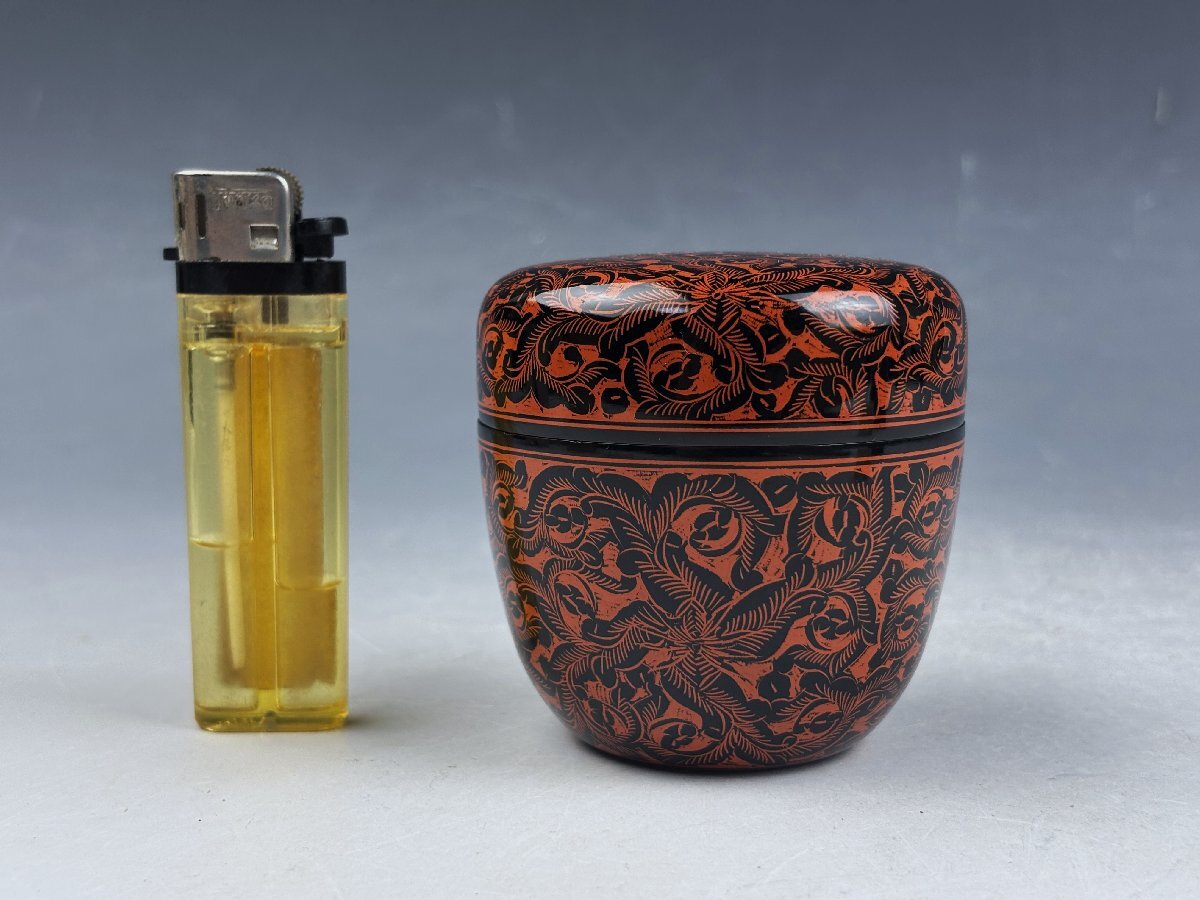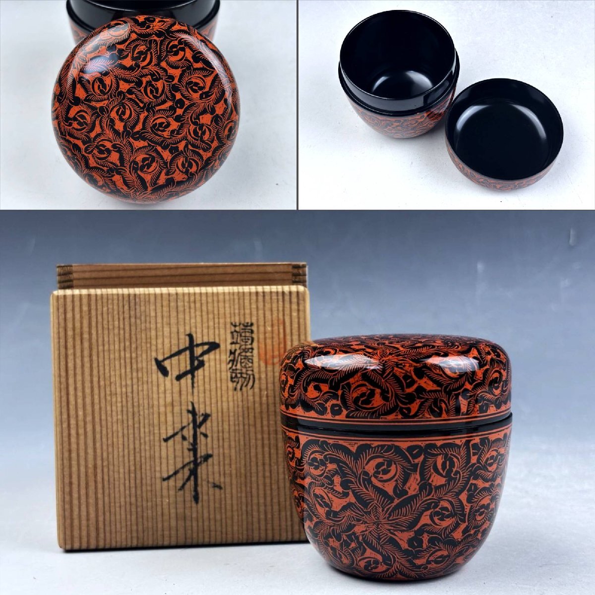 讃岐塗 蒟醤塗 冨山昇斎 朱彩唐草文 中棗 薄茶入 無傷 共箱 茶器 茶道具 和食器 文華堂 キンマ 漆工芸 古美術骨董品 XSY208