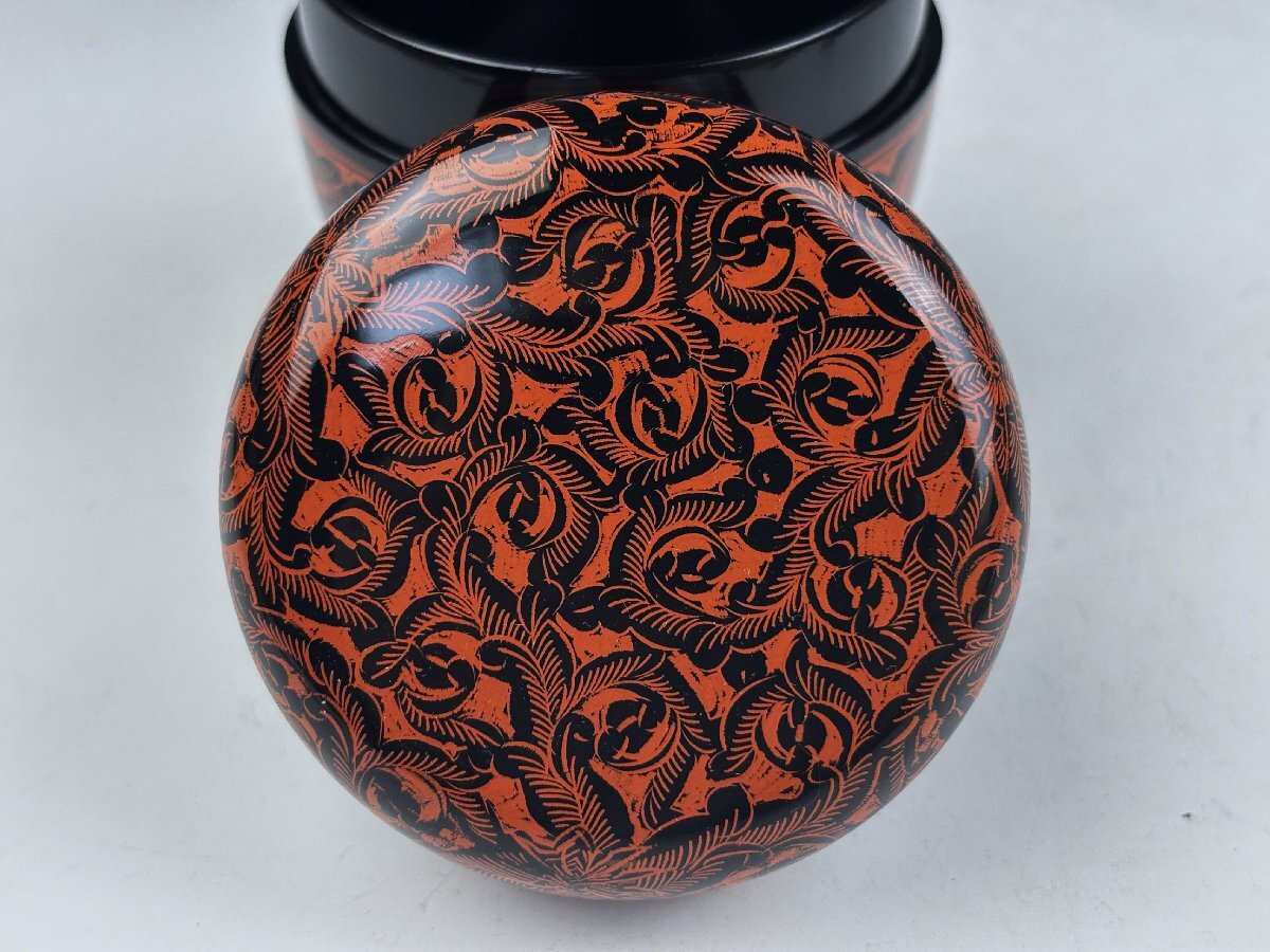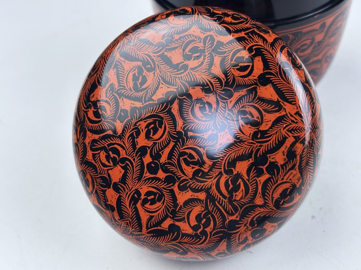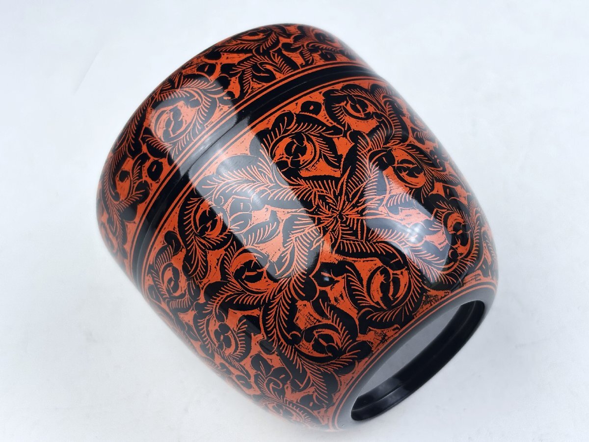讃岐塗 蒟醤塗 冨山昇斎 朱彩唐草文 中棗 薄茶入 無傷 共箱 茶器 茶道具 和食器 文華堂 キンマ 漆工芸 古美術骨董品 XSY208