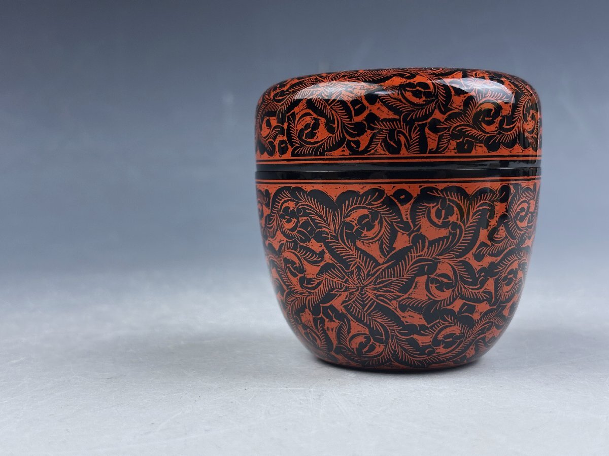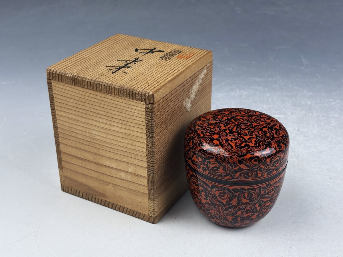 讃岐塗 蒟醤塗 冨山昇斎 朱彩唐草文 中棗 薄茶入 無傷 共箱 茶器 茶道具 和食器 文華堂 キンマ 漆工芸 古美術骨董品 XSY208【遅日亭】