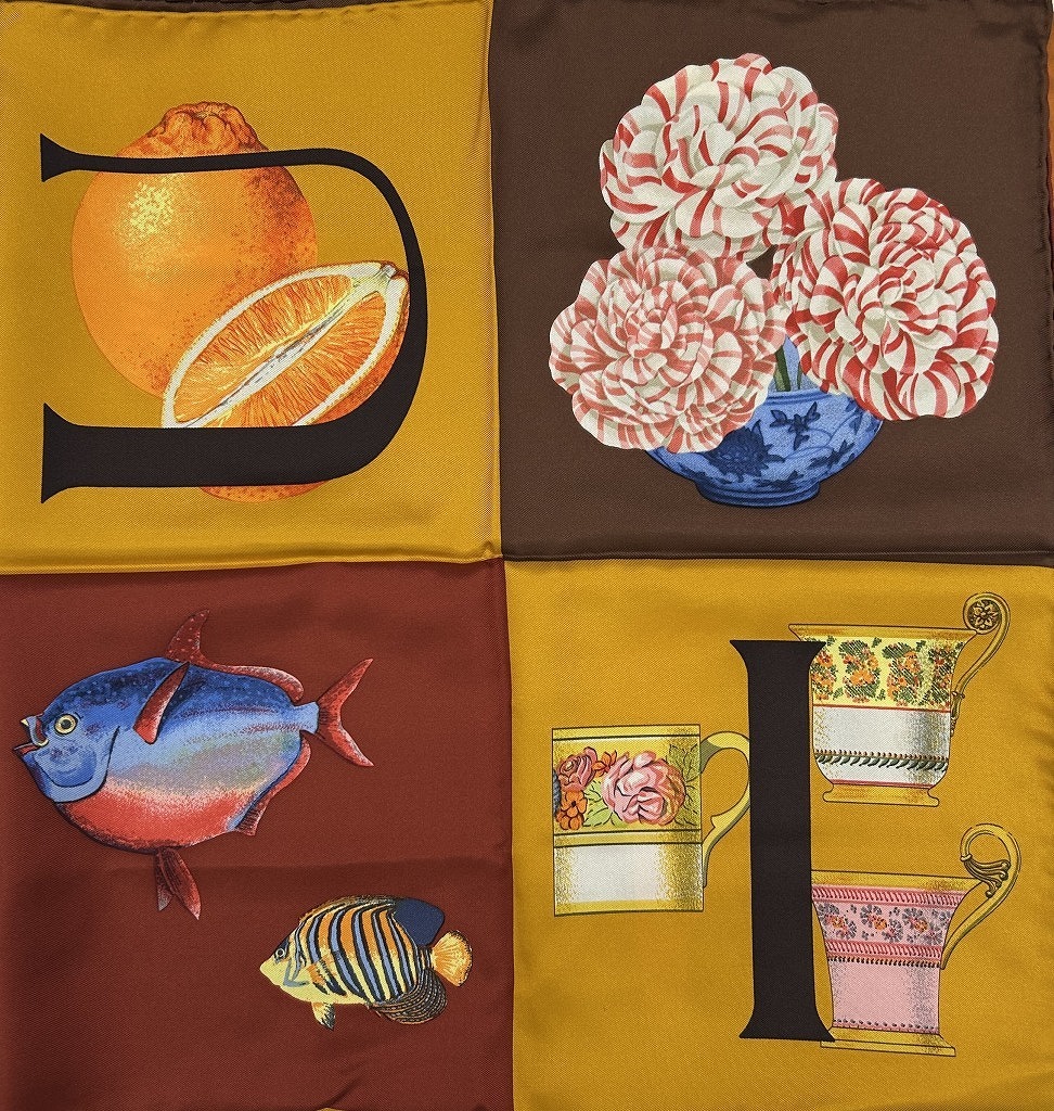 商品説明ロゴのアルファベットや製品のイラスト(バンブーバッグなど)がランダムにデザインされたとてもおしゃれなシルクスカーフ。