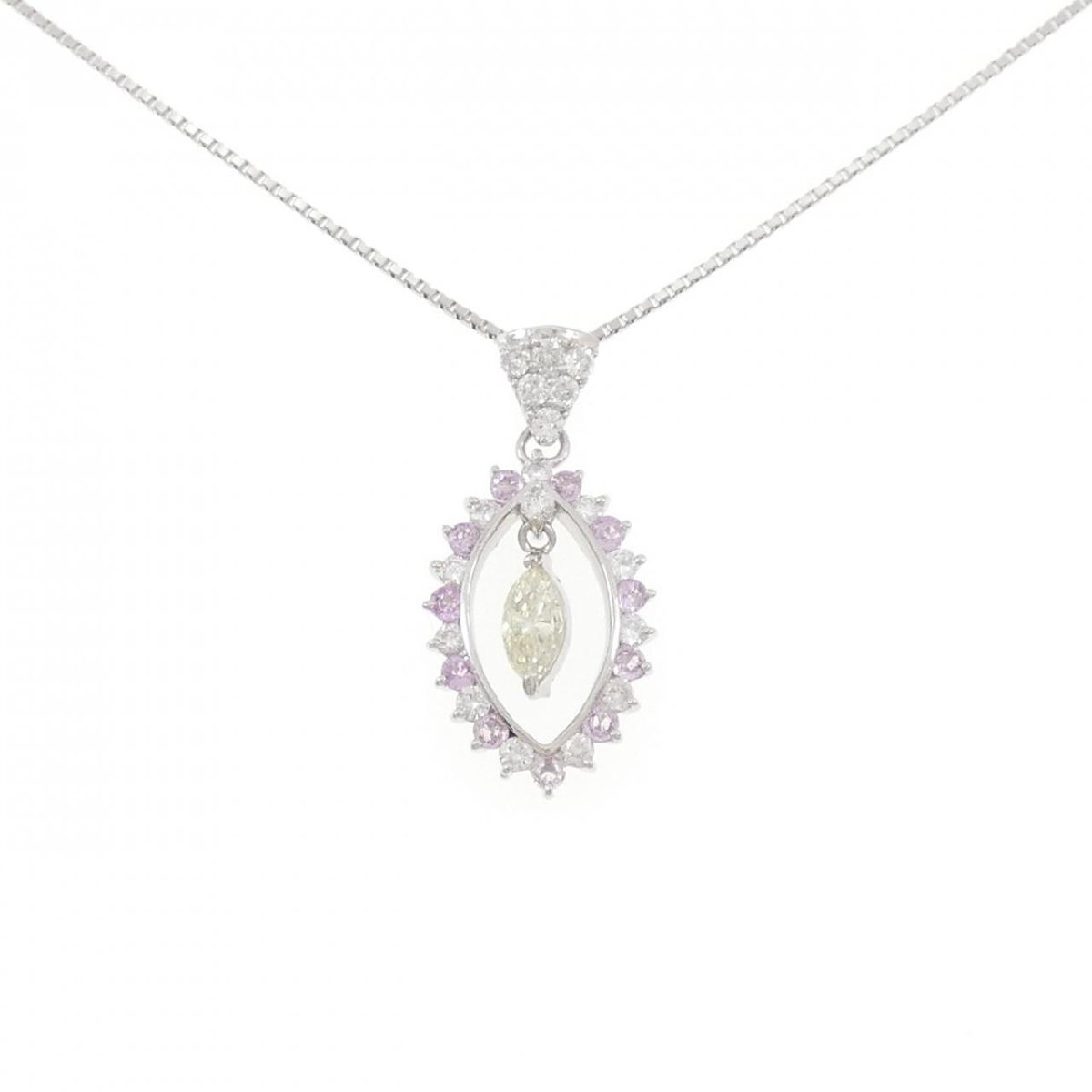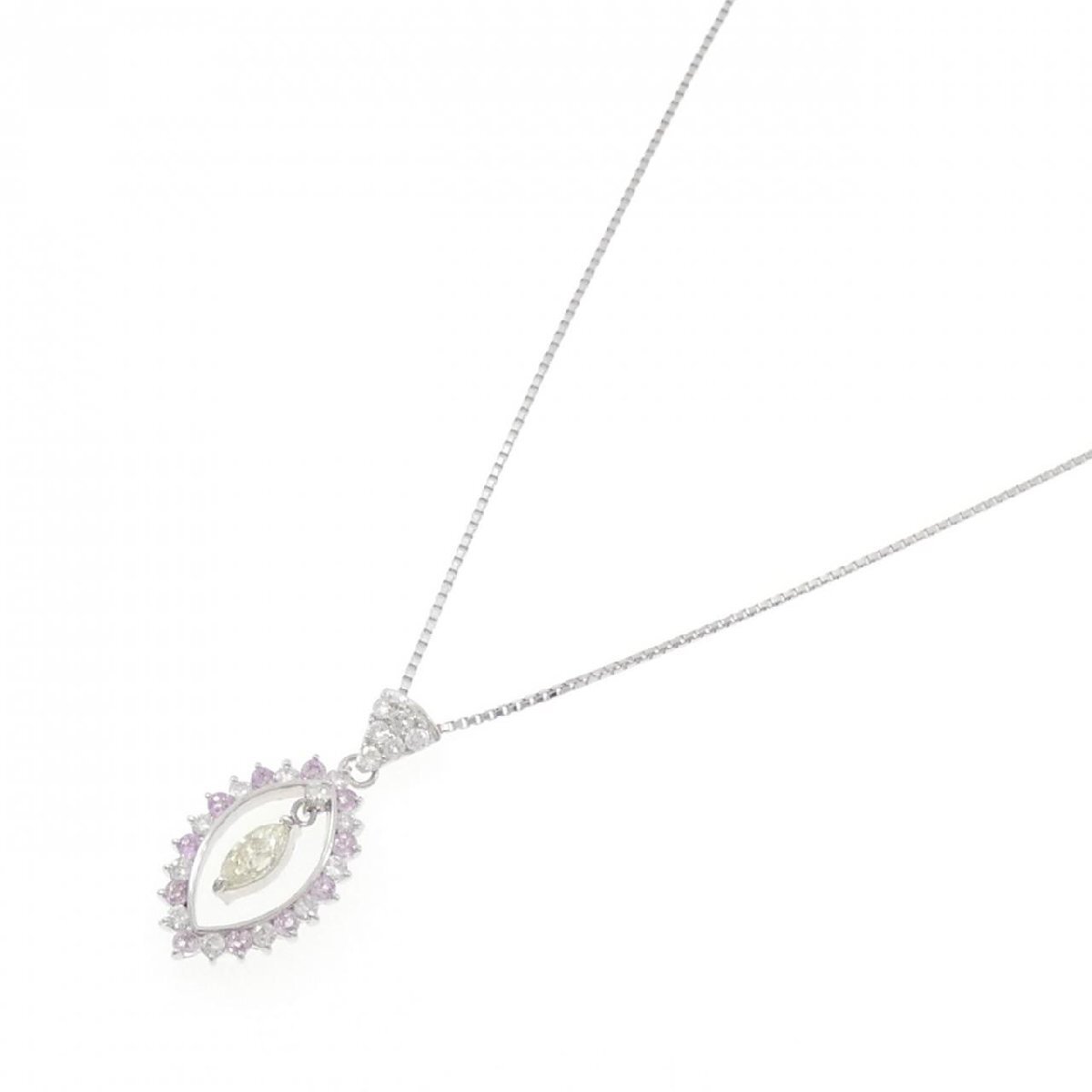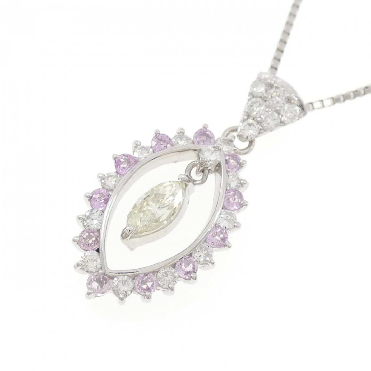 プラチナの知的な光沢に、中央の粒状のダイヤモンドと、周囲のピンク系のサファイアが美しいコントラストを描きます。優美な曲線を描くデザインが、デコルテに華やかな彩りを添えます。