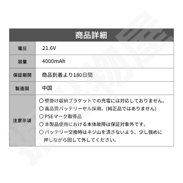 ■安全保証 :過電流保護機能、過充電防止機能、過放電防止機能、保護回路搭載。バッテリーを壊れないよう守ります。