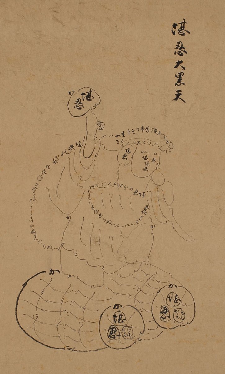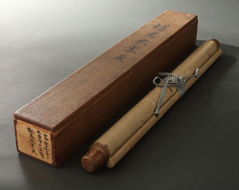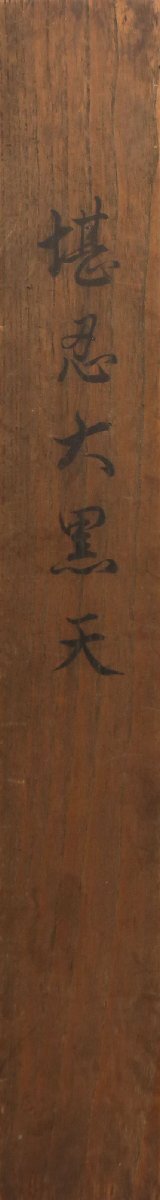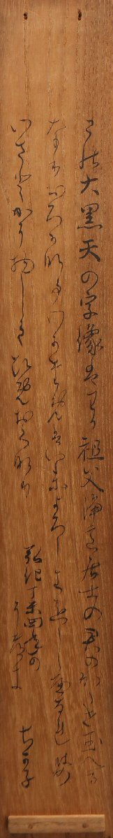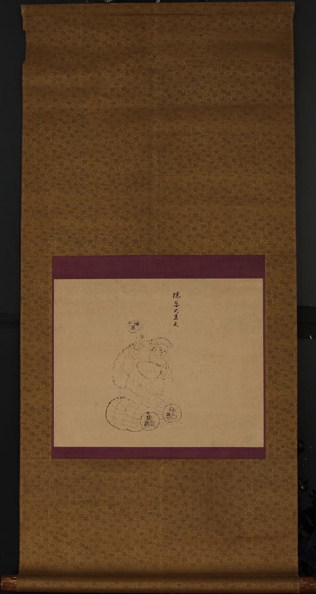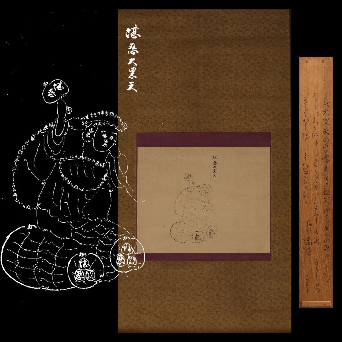 上田伊兵衛の堪忍大黒天図です。 大黒天を描いておりますが、「堪忍」「かんにん」「一生のまもり本尊誰ありて堪忍佛と知る人もなし」「堪忍の袋をつねに首にかけ破れたら縫へゝゝゝゝゝゝ」の文字絵となっております。 伊兵衛は幕末の歌人・上田ちか子(重子)の祖父として知られます。ちか子が生前東山仁王門・専称寺に建立した寿碑によれば、ちか子は「河東大西清之祐」の子で、文政2(1819)年父の死により母方の祖父・伊兵衛の元で養育されましたが、祖父・祖母・義理の兄弟などもやがて次々と亡くなり、紀州藩士の国学者・長澤伴雄の妻となったことが綴られております。 ちか子の出自は「富める青楼」であったことが富岡鉄斎の証言により知られ、「河東」の地名から当時聖護院村(現・京都市左京区、京都大学近辺)に存した遊廓・二条新地であったことが推察されます。ちか子は妓楼「近江屋幾」を継ぎ、自らも芸妓として活動しながら、境遇の似た大田垣蓮月や島原輪違屋の花魁・桜木太夫と交流を重ねたとみられます。 しかし天保の改革の余波を受け天保12(1841)年には二条新地の営業が停止、幕末期には他の花街とともに期限付きの公許を受けながら、祇園北側や末吉町で「近江屋幾(近江幾)」として出店していたようです。蒲柳の質でもあり、伴侶長澤伴雄と死別したのちの文久2(1862)年には死を悟り前述の寿碑を建立しておりますが、明治27(1884)年、76歳まで生きたことが知られます。没年より、本作の箱書は39歳に認められたことがわかります。 ちか子の歌才は夫伴雄の尽力もあり京の風流人士に愛誦されたほか、文筆の才を活かし「免許代言人」として活動していたことが窺われます(『続大阪弁護士会史稿 戦中編』)。二条新地はその後京都帝国大学の設立により消滅しますが、悲運にも負けず維新の時代を強かに生きた才女が、終生胸に秘めた「堪忍」の重みをご堪能ください。 ◆上田伊兵衛 江戸後期の二条新地(川東町)の妓楼・近江屋の主人。法名は浄意。 ◆上田ちか子 幕末~明治期の歌人。二条新地(川東町)の妓楼・近江屋の娘。祖父・上田伊兵衛の元で育てられ、自らも望んで芸妓となる。国学者・長澤伴雄の深い馴染となり、長澤のもとで和歌を学ぶ。大田垣蓮月・島原桜木太夫とともに幕末京都の女流歌人として著名。明治期には末吉町に妓楼「近江屋幾(近江幾)」を開業し、遊女たちの代言人としても活動した。明治27(1884)年没、76歳。 〔箱書〕 この大黒天の字像はわか祖父浄意居士の君のかゝせ玉へる なりおろかなるわかためはいとよろしきをしへなれは わさとかう物してひめおくなり 弘化丁未四(1847)年のうつき ちか子 付属:上田ちか子の識箱が付属します。 寸法:高さ91cm、幅43cm(最大幅。若干の誤差はご了承下さい) 状態:経年のイタミがございます。 |