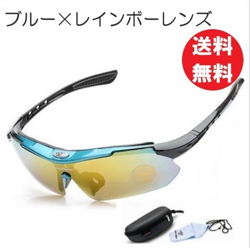 送料コミコミ☆収納ケース付 スポーツサングラス 4点セット ブルー×レインボーレンズ 紫外線カット サングラス メンズ ランニング
