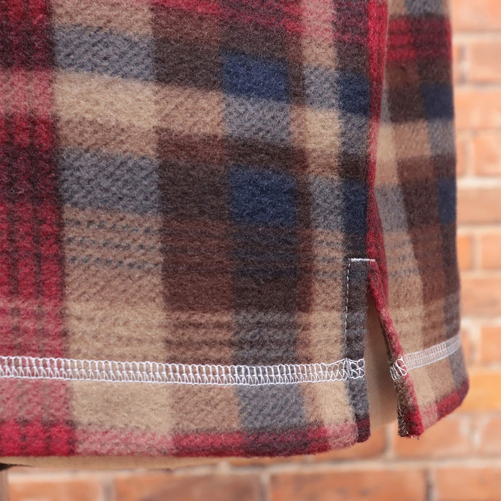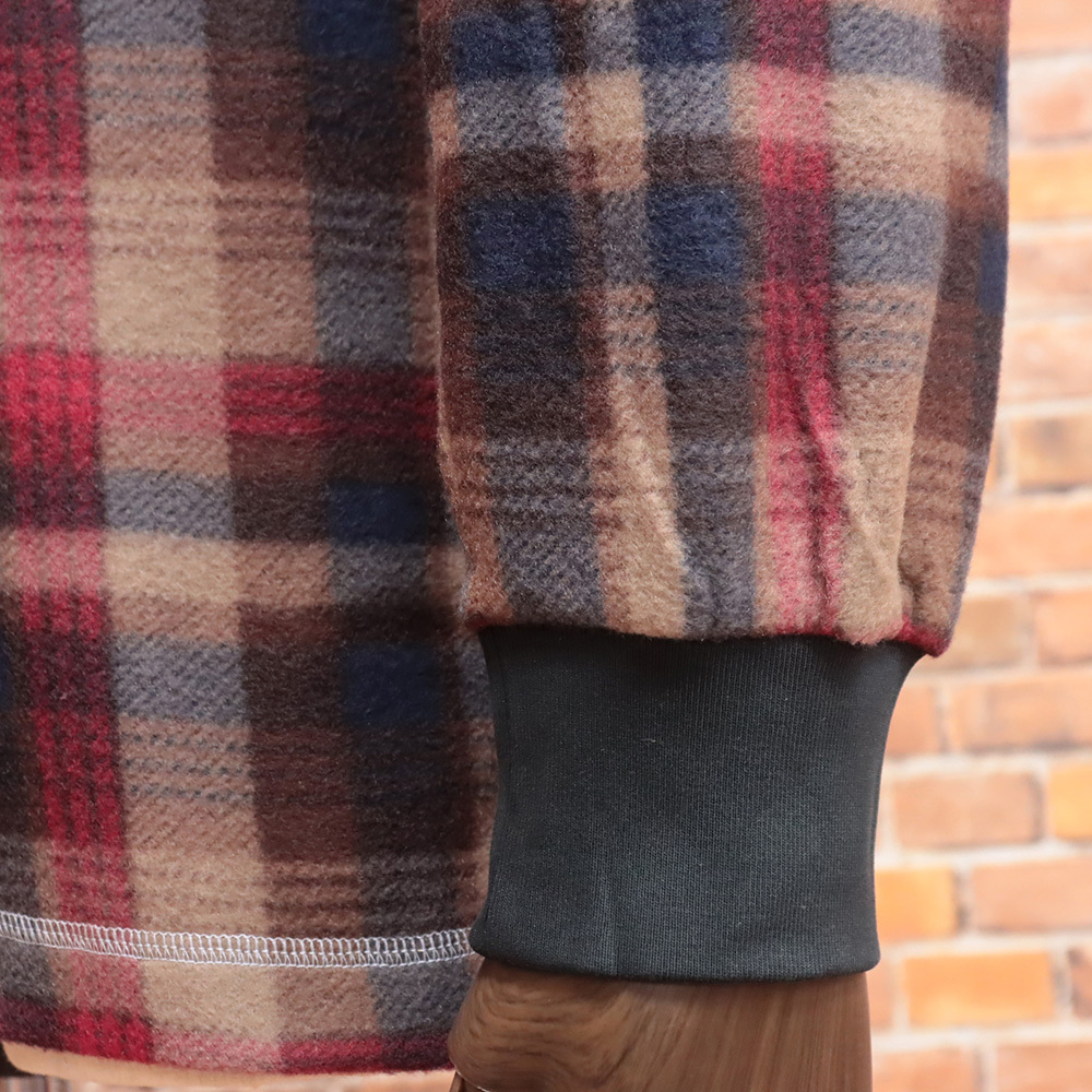 絶妙な配色のチェック柄に、袖口の配色リブがアクセントとなり、派手になりすぎない洒落感を演出。左胸にはロゴ刺繍入りポケットを備え、実用性とデザイン性を兼ね備えています。