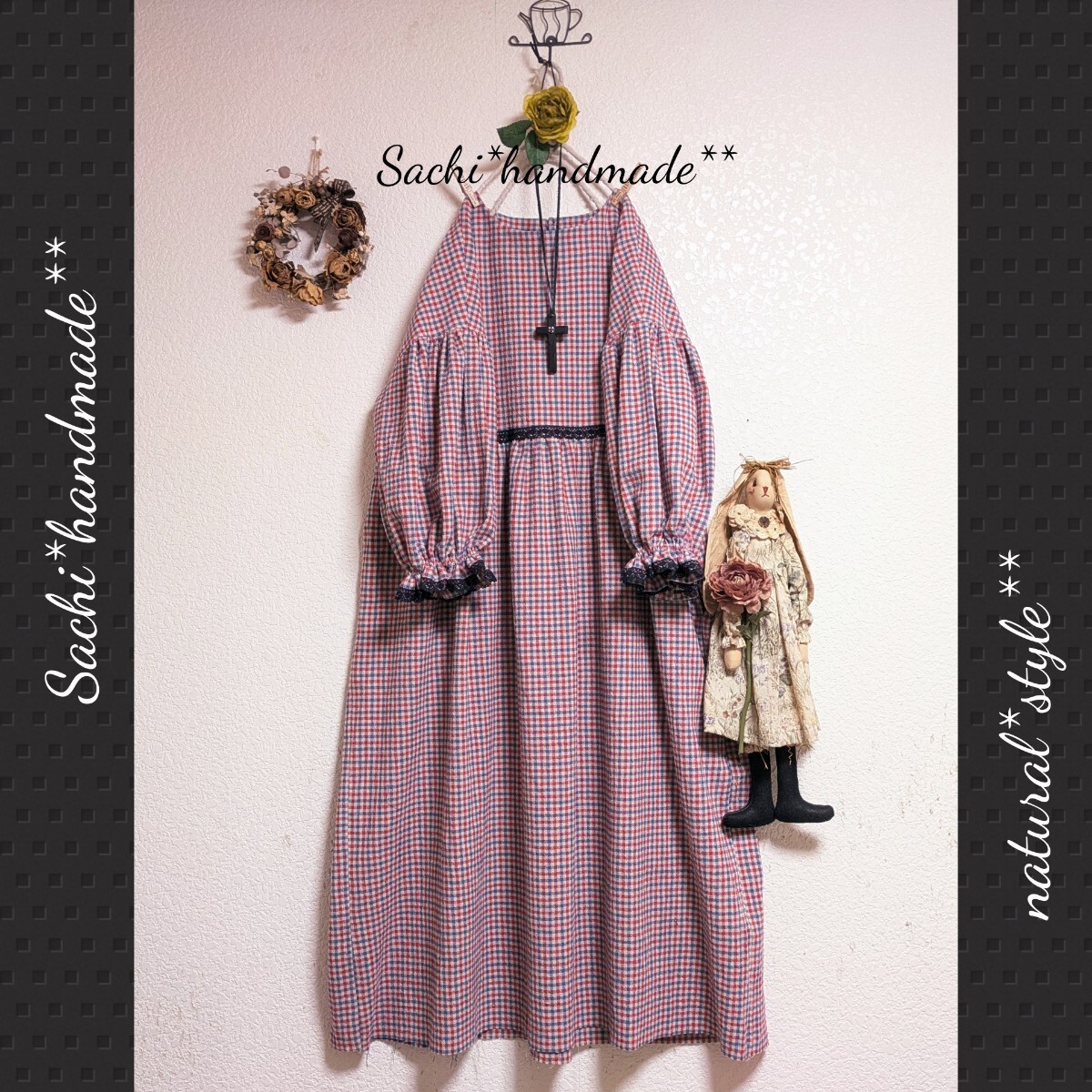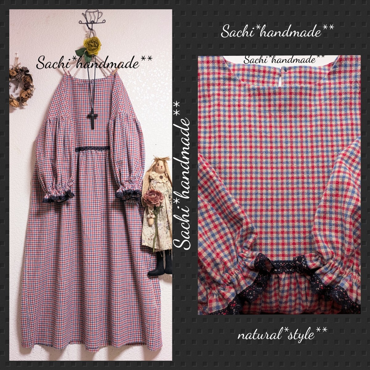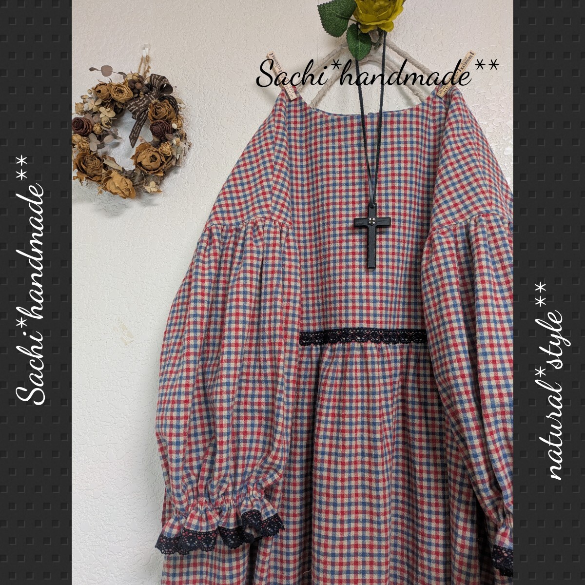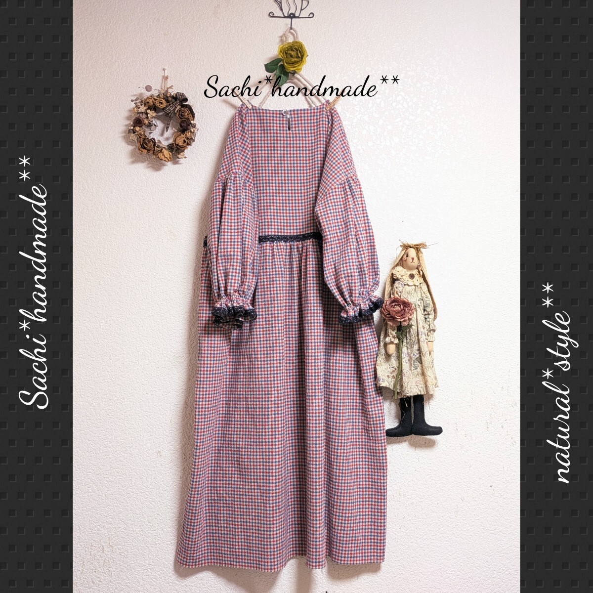 トリコロールチェック☆ロングギャザーワンピース☆ふりふり袖☆両脇シームポケット付き☆丈(身丈)オーダー☆natural*style**