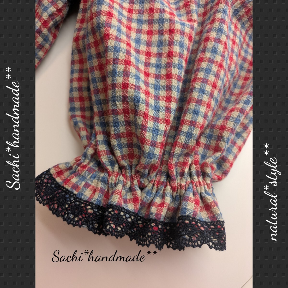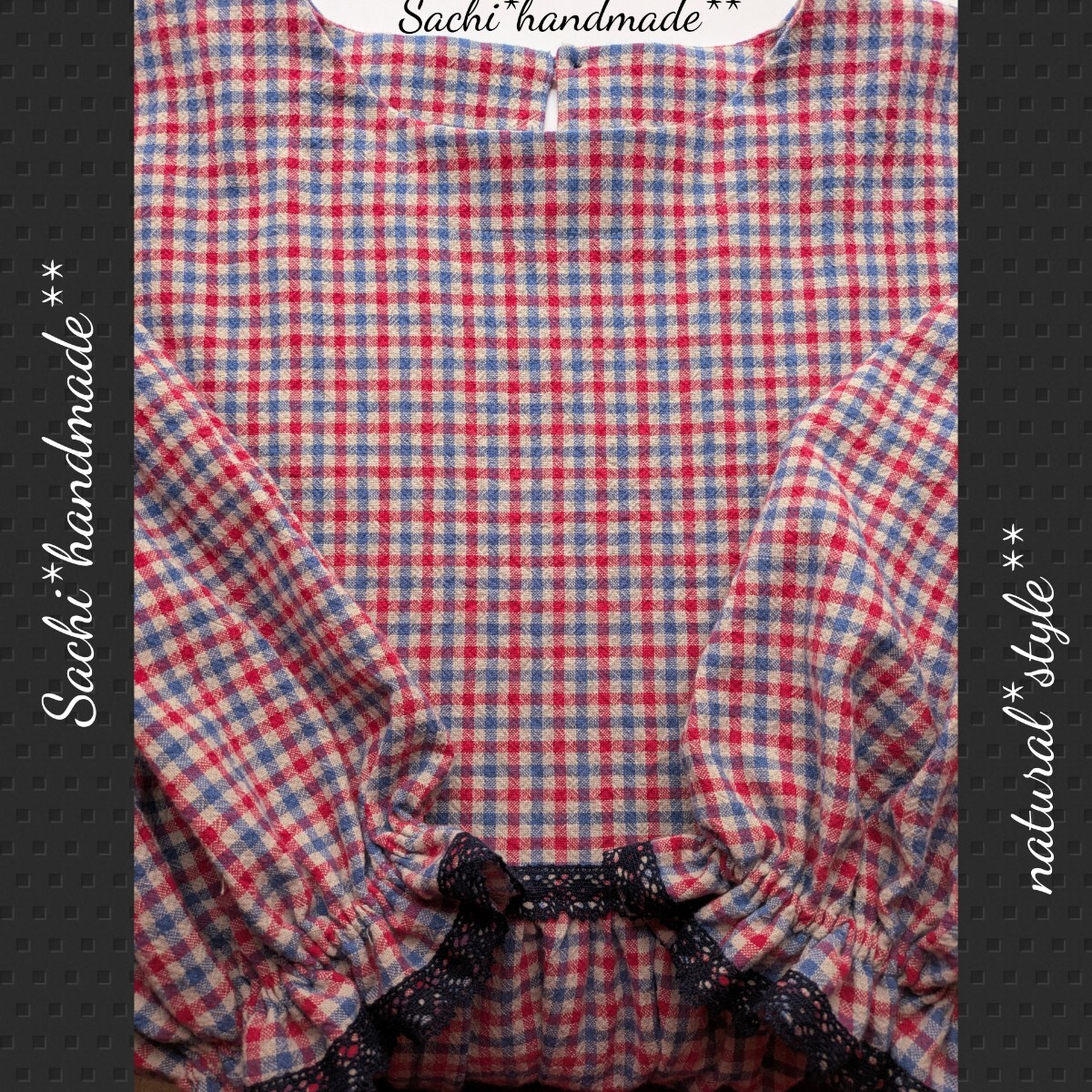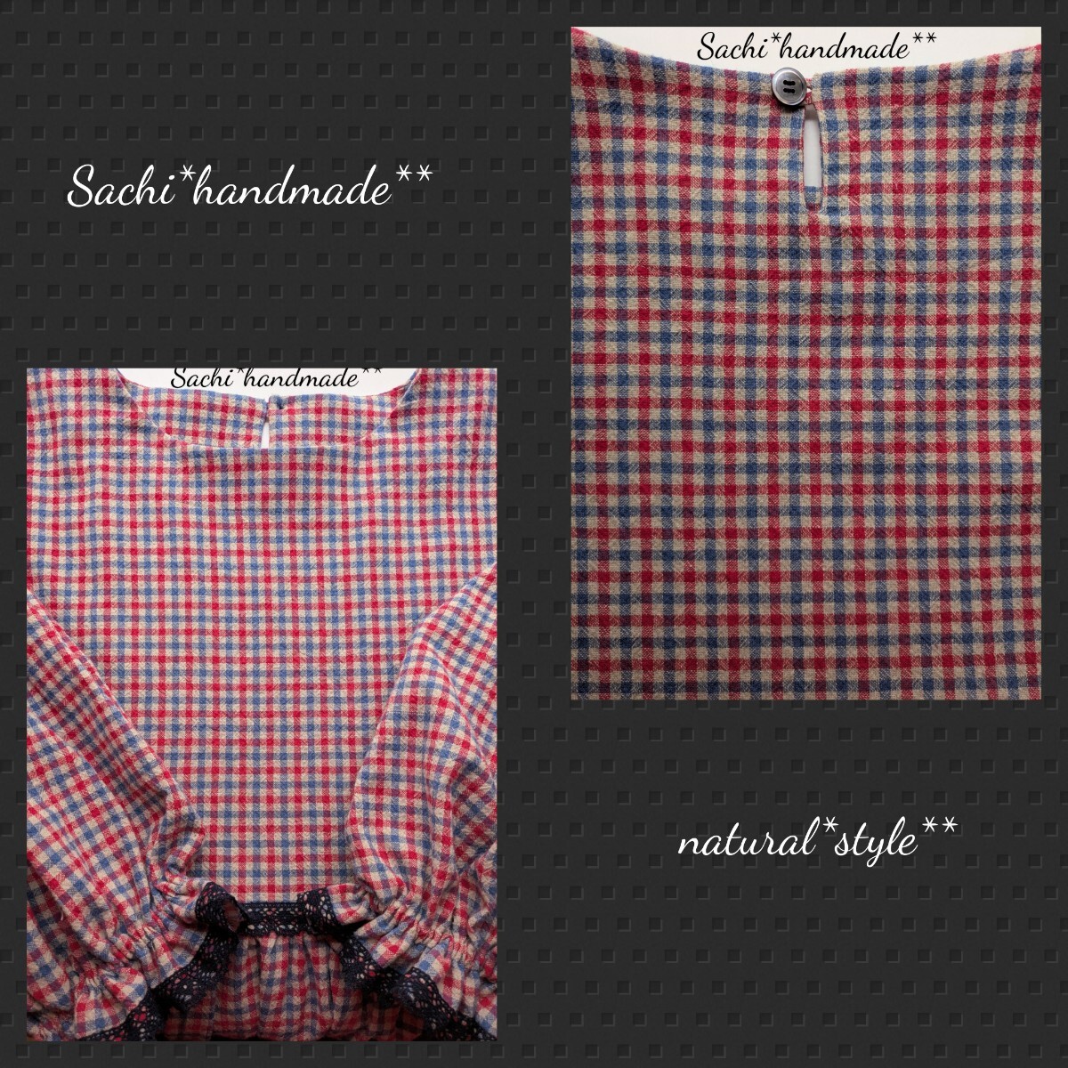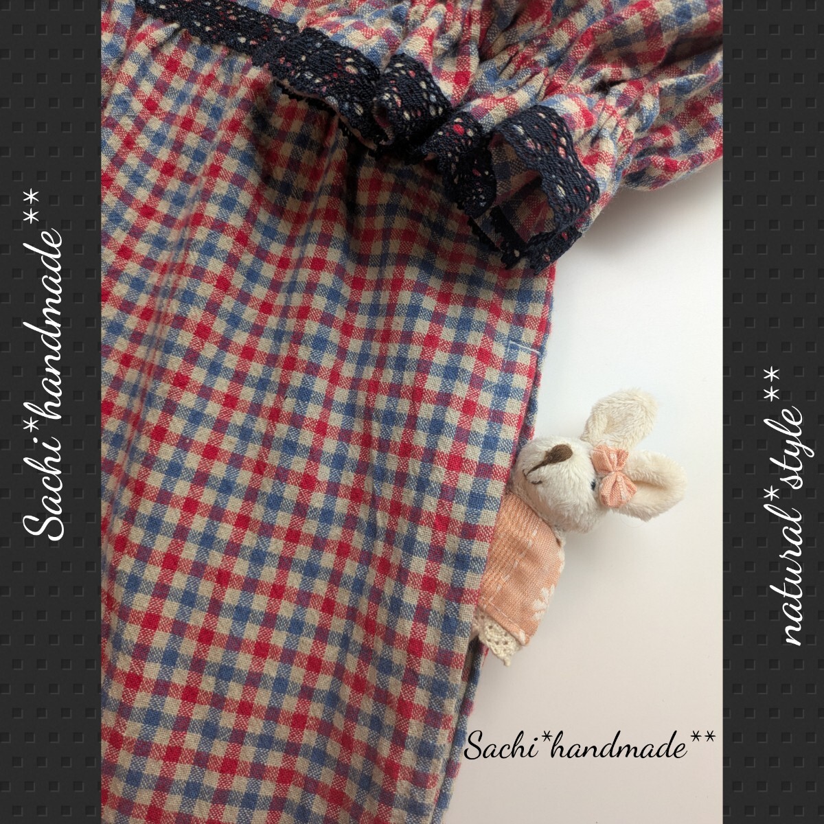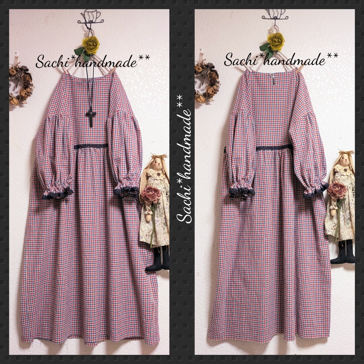 トリコロールチェック☆ロングギャザーワンピース☆ふりふり袖☆両脇シームポケット付き☆丈(身丈)オーダー☆natural*style**