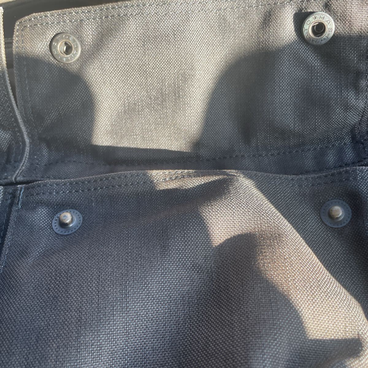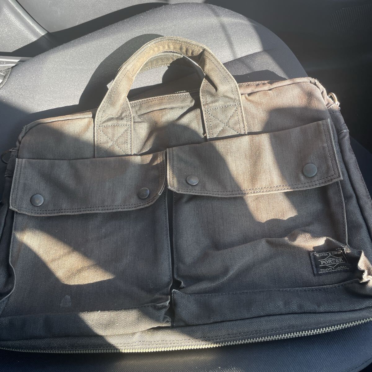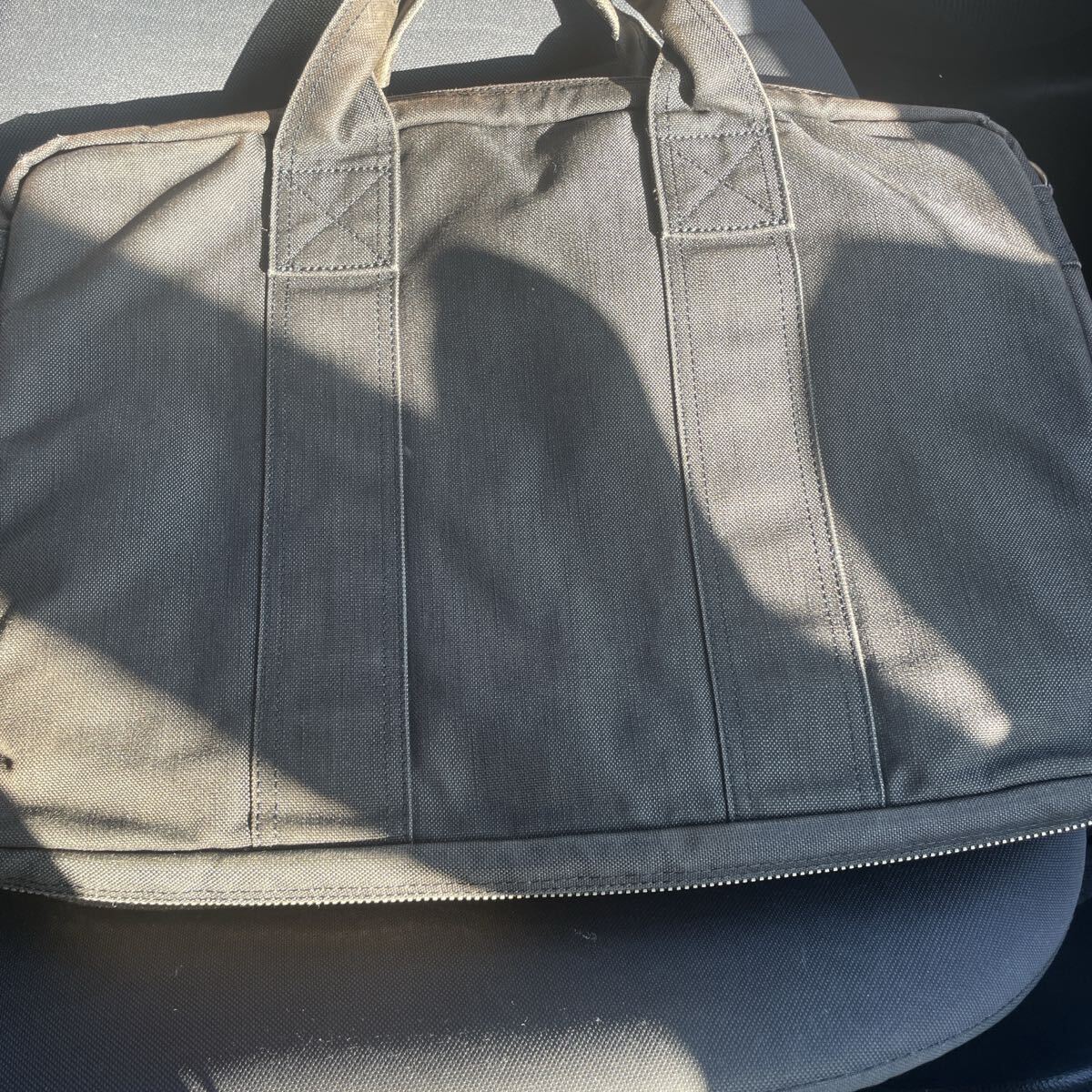 グレーのキャンバス素材で、2つのフロントポケットを備えたビジネスバッグ。