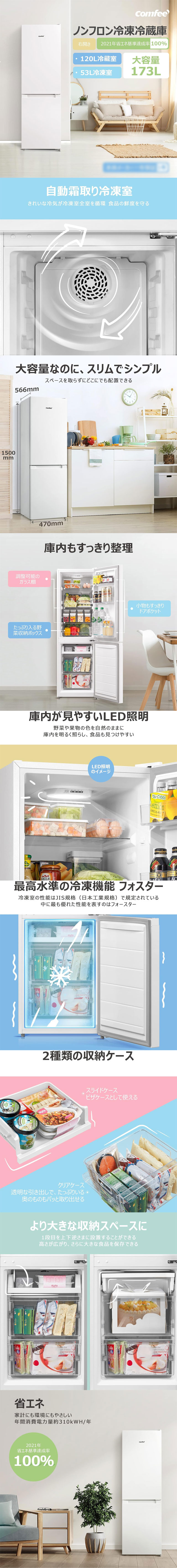 コンフィー(美的集団) 2ドア冷蔵庫 RCB179WH を出品いたします。 ■特徴■ 大容量の冷蔵庫で、 スリムでシンプル ファン式の冷却方法 冷凍室に冷気を循環させて冷却することで、 自動で霜取りを行います。 きれいな冷気が冷凍室を循環、 隅に置いても食品の鮮度を守ります。 大容量冷蔵室、たっぷり収納 冷蔵室 120L、大容量で整理もしやすい。 可動式のガラス棚やケース、 ドアポケット付きで、庫内をすっきり整理できます。 大容量冷凍室 53L大容量冷凍庫、BIGサイズフリーサー 野菜収納ボックス 野菜収納ボックスの位置も調整可能です。 大容量野菜を収納することができます。 温度調節可能の冷蔵室 冷蔵室の温度は4段階の温度調節が可能です。 季節や収納食材に合わせて庫内温度が調整できます。 さらに、温度調節ボタンを3秒長押して、 LED②とLED③が30秒以上に点灯した後に、 急速冷凍モードに入ります。 ■仕様■