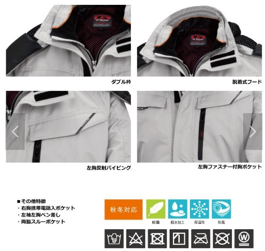 ◆特徴:右胸携帯電話入ポケット・ダブル衿・左袖・左胸ペン差し・内ポケット・脱着式フード・左胸反射パイピング・左側ファスナー付胸ポケット・両脇スルーポケット