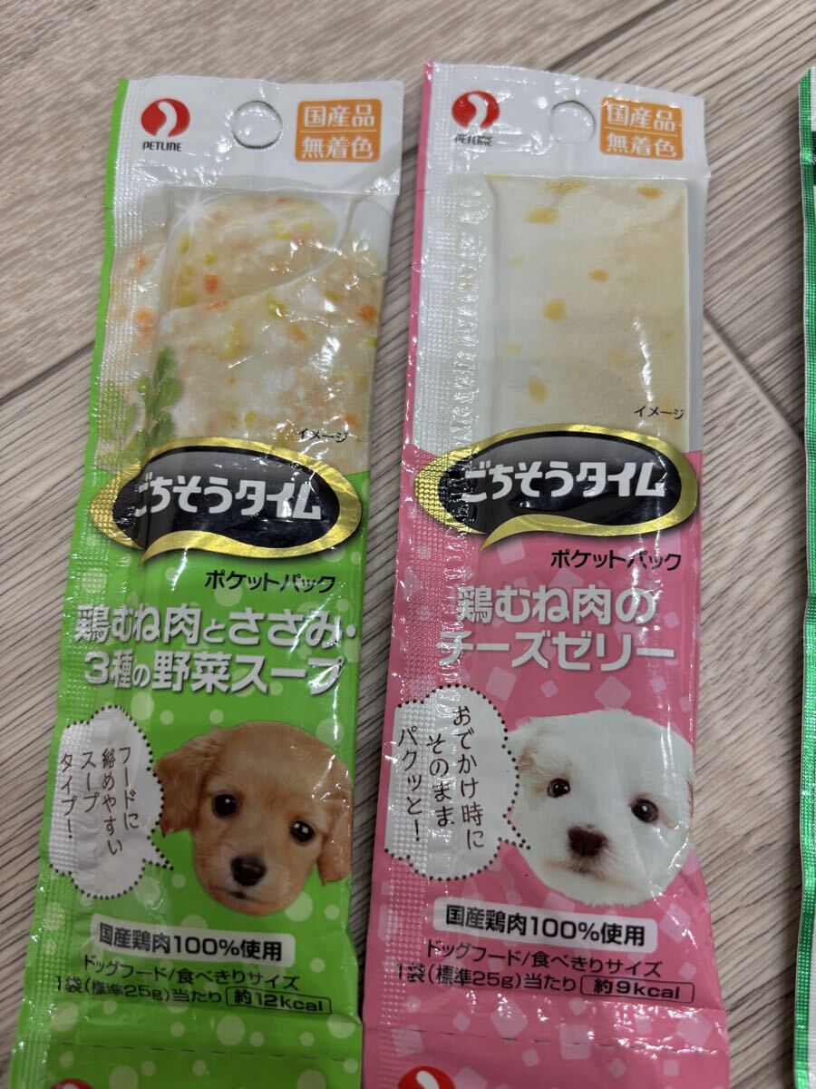 鶏肉と野菜のスープとチーズゼリーのウェットトリーツ、複数パウチ入りで犬のおやつに最適。