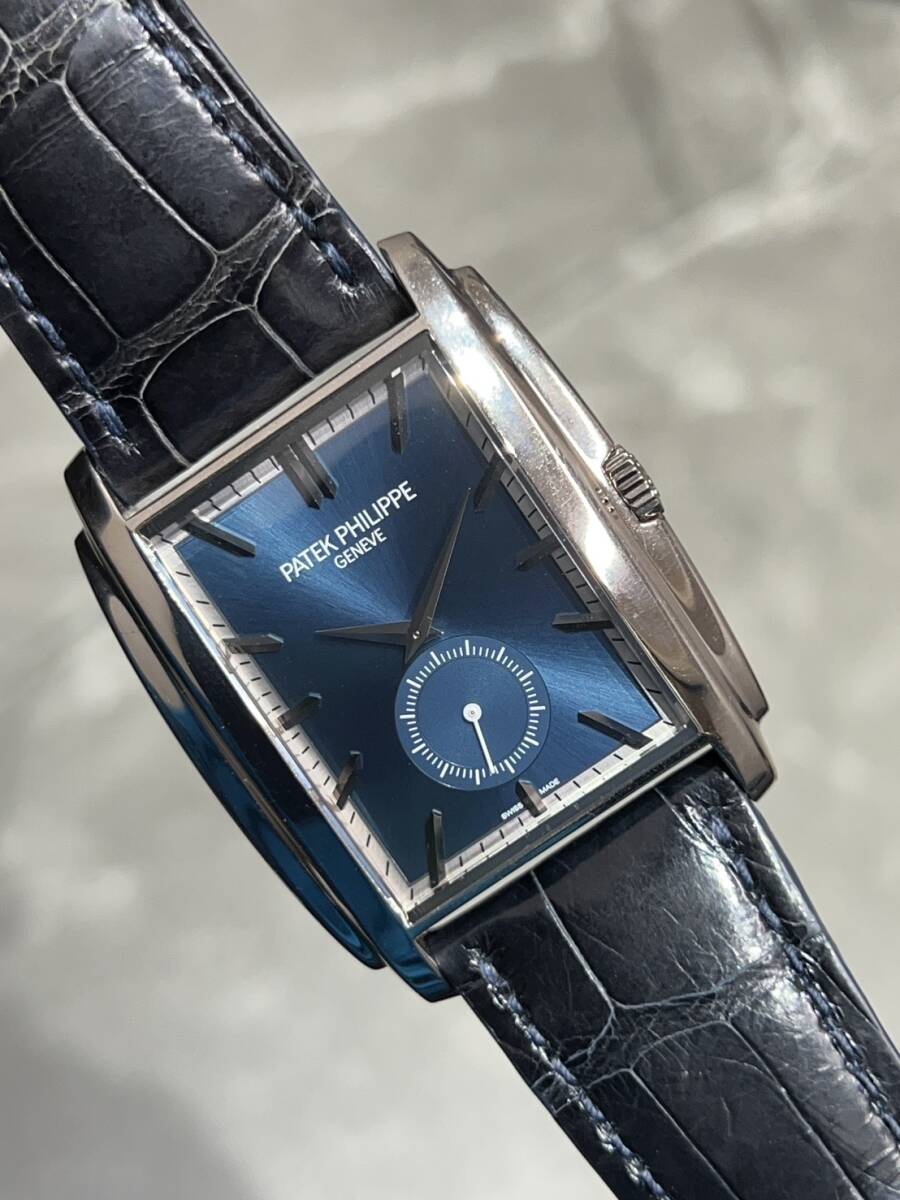 ホワイトゴールドのレクタンギュラーケースに、美しいブルーのサンレイダイヤル、光を反射するインデックスで高貴な雰囲気に溢れております。