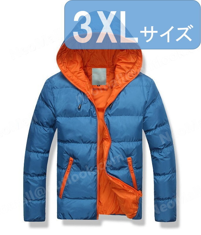 フード付き メンズ ダウン 004 ブルー×オレンジ 3XLサイズ 中綿ダウン 中綿ベスト キルティング アウター 防寒 秋冬 暖かい