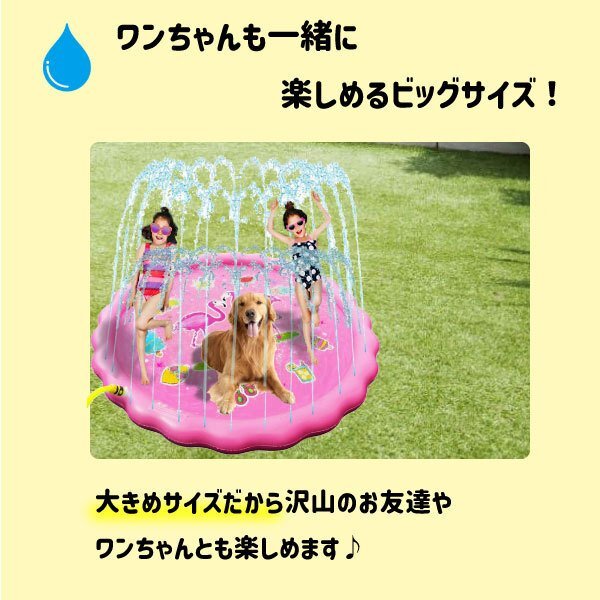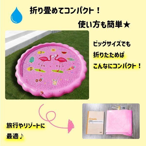 | ☆噴水 フラミンゴ プール 170cm 【商品名】 噴水 フラミンゴ プール 【素材】 PVC 【サイズ】 直径:170cm 【商品内容】 本体 バルブ *ホースは付属しません 【この商品の特徴】 ◆お手軽に楽しめる噴水プールです。空気入れいらずで水圧により噴水が楽しめます♪ ◆たたむとコンパクトサイズになり、ちょっとしたリゾートや夏の旅行に携帯するのに便利★ ◆直径170cmと大きいので大人もワンちゃんも楽しめます!友達みんなで遊んでもいいですね! ◆かわいいフラミンゴ柄で暑い日でも楽しく噴水水遊び! | ||||