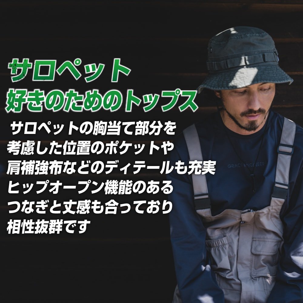 ポケットは胸当て部分を意識し、肩にはサスペンダー補強布もあるサロペット好きのためのクルーネック