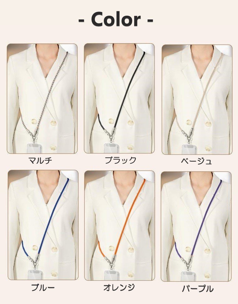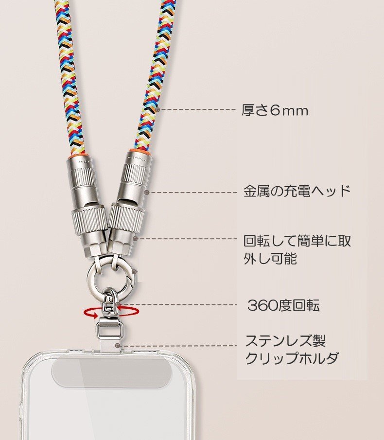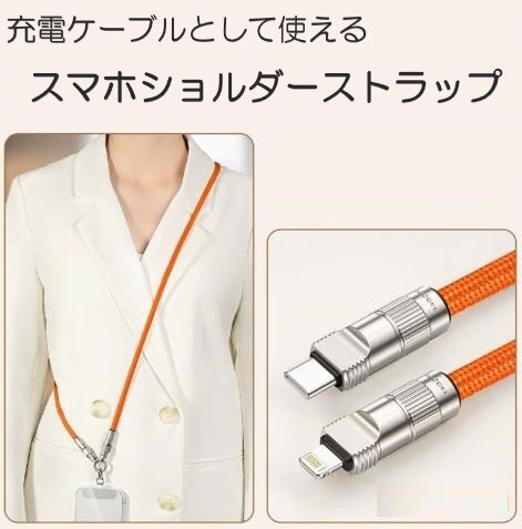 スマホショルダーストラップ オレンジ 120cm 充電ケーブル 2in1 TypeC + Lightning 充電コード 斜めがけ 肩掛け