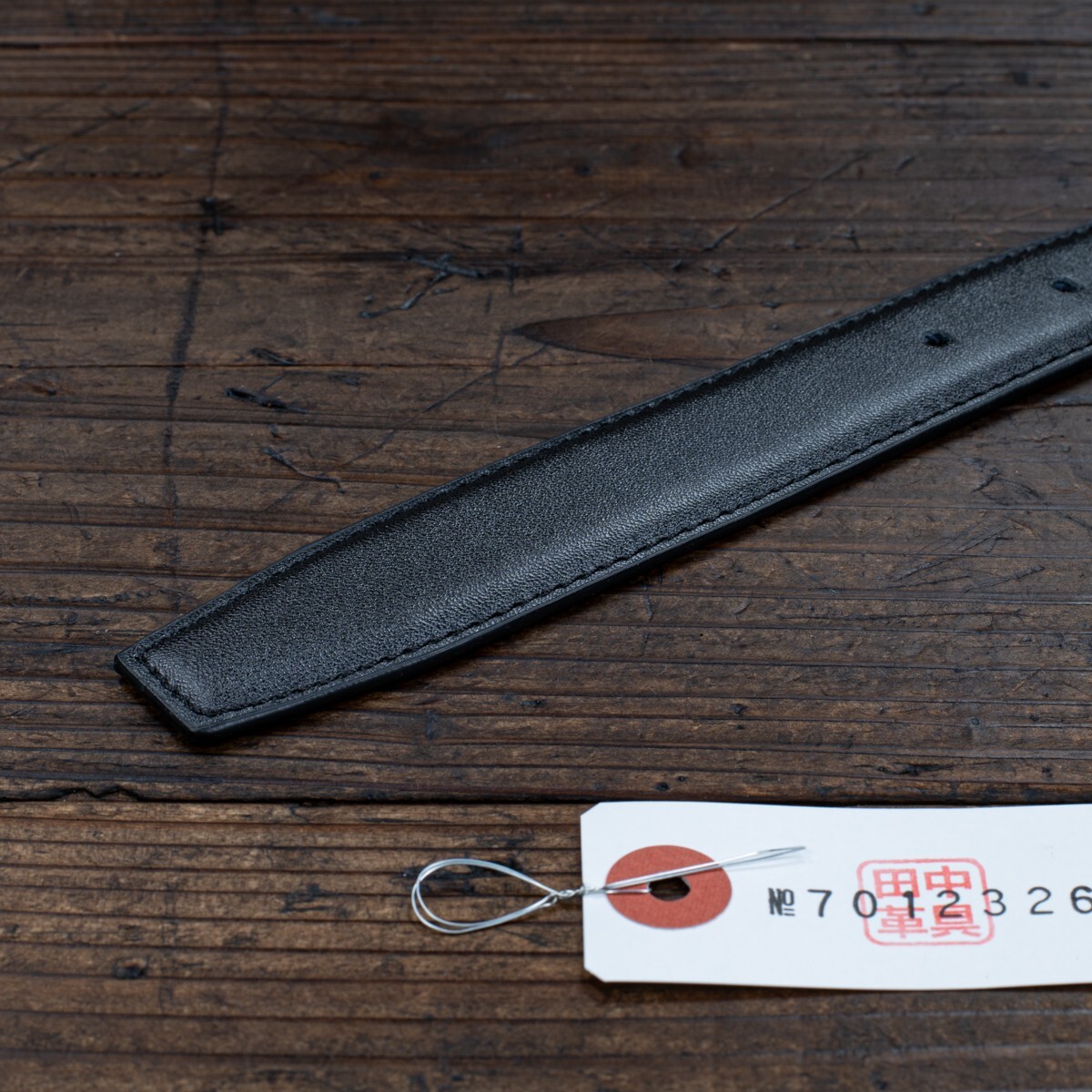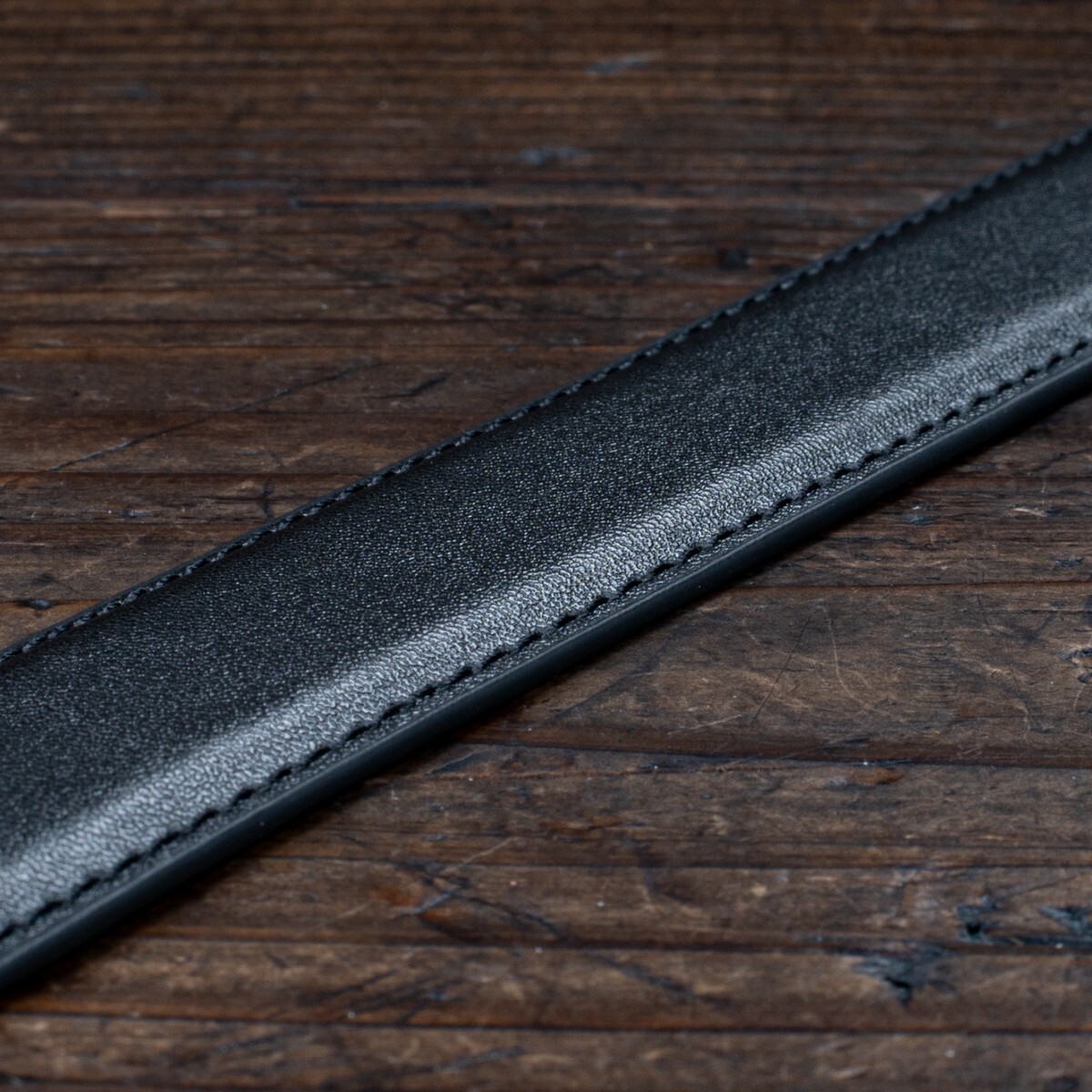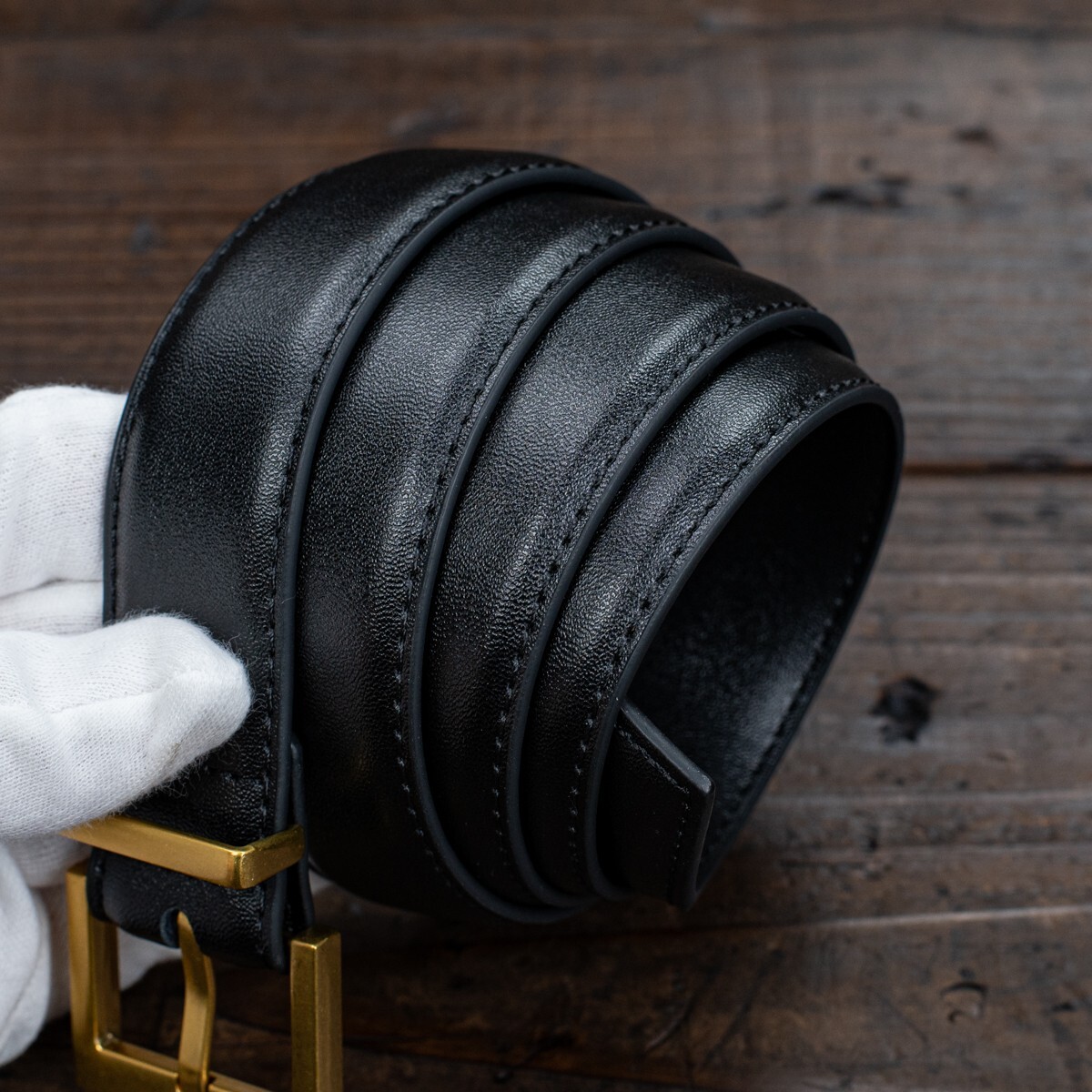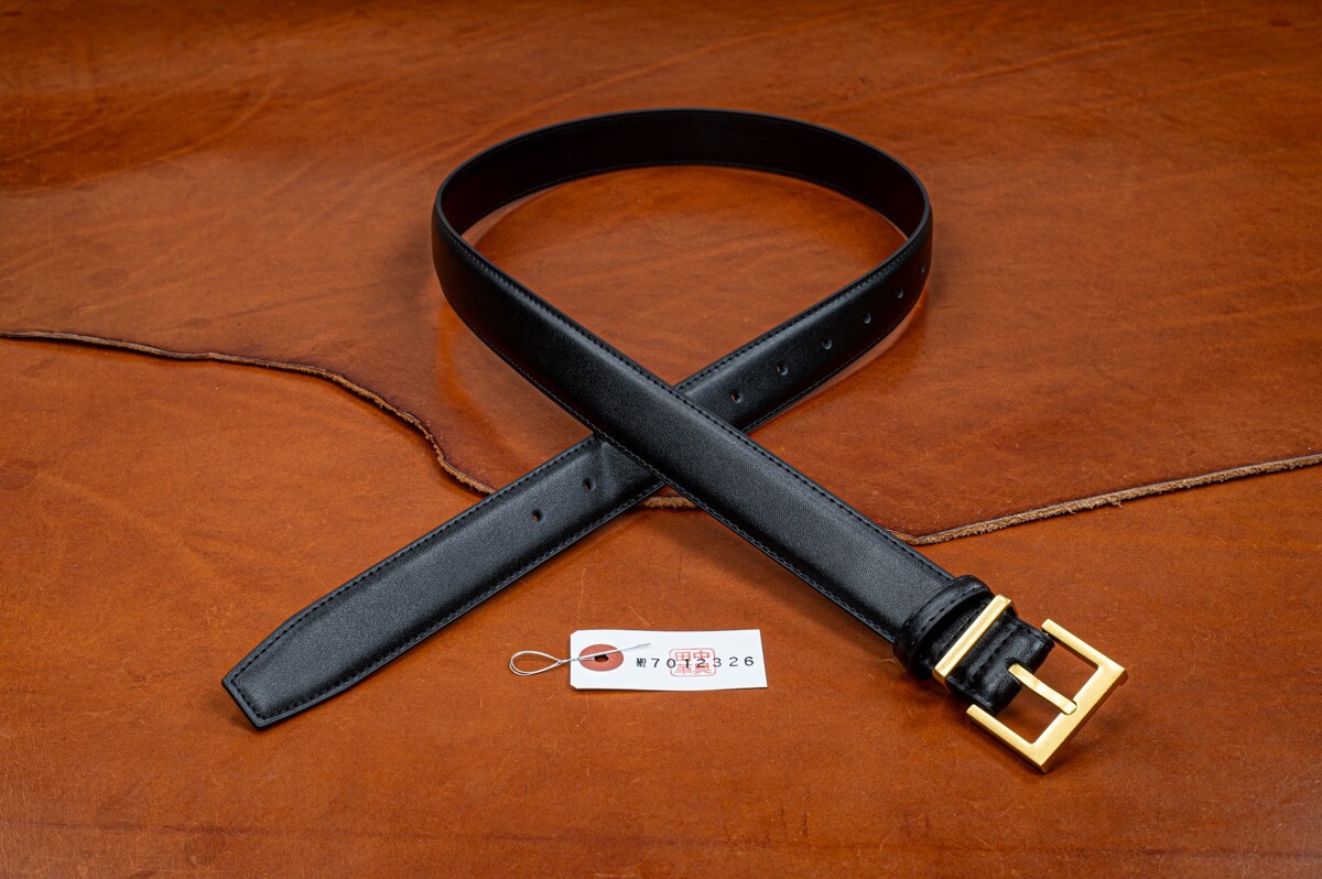 イタリアンレザーを使った細身のベルトです。革は両端をステッチでしっかりと留め、立体感を出しています。表面には細かなシボがあり、自然な光沢が高級感を引き立てています。腰に巻いたときにはしなやかさが感じられ、柔らかな着け心地です。