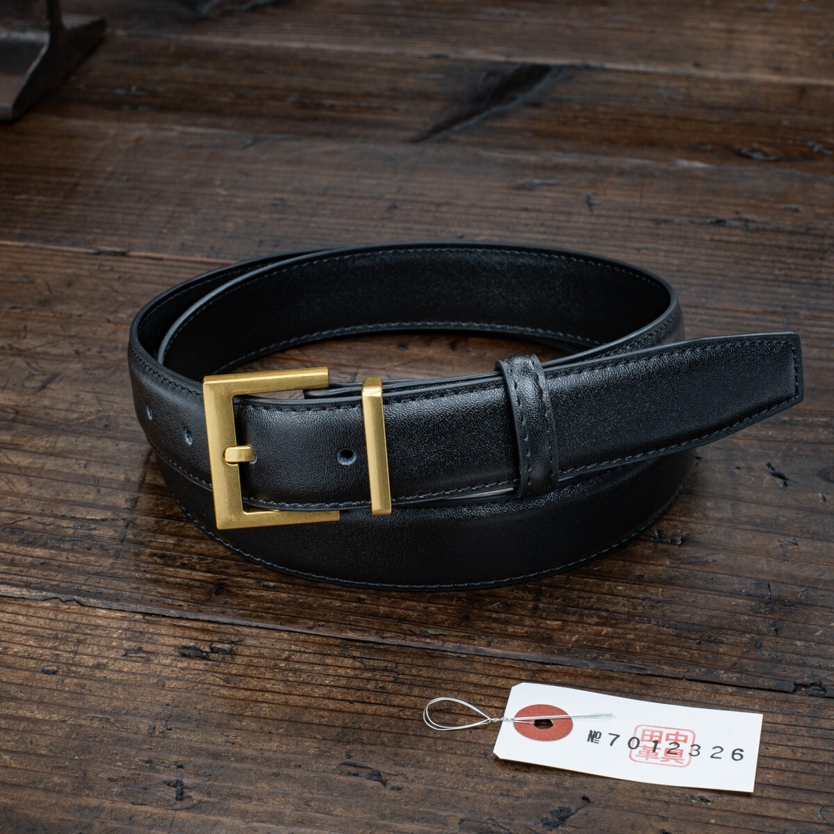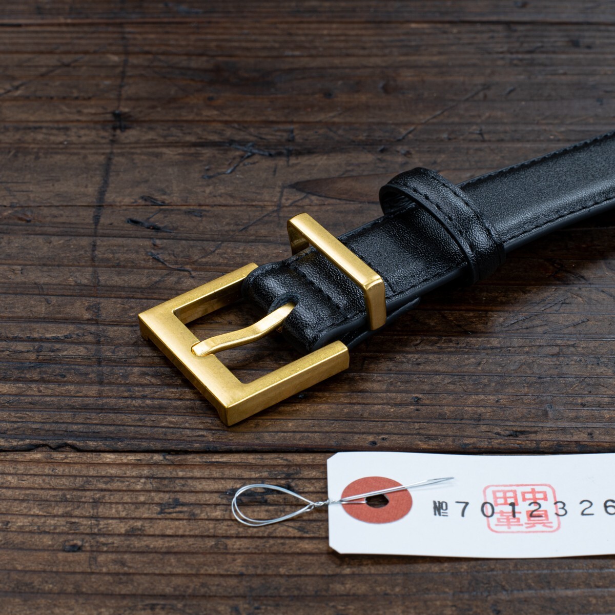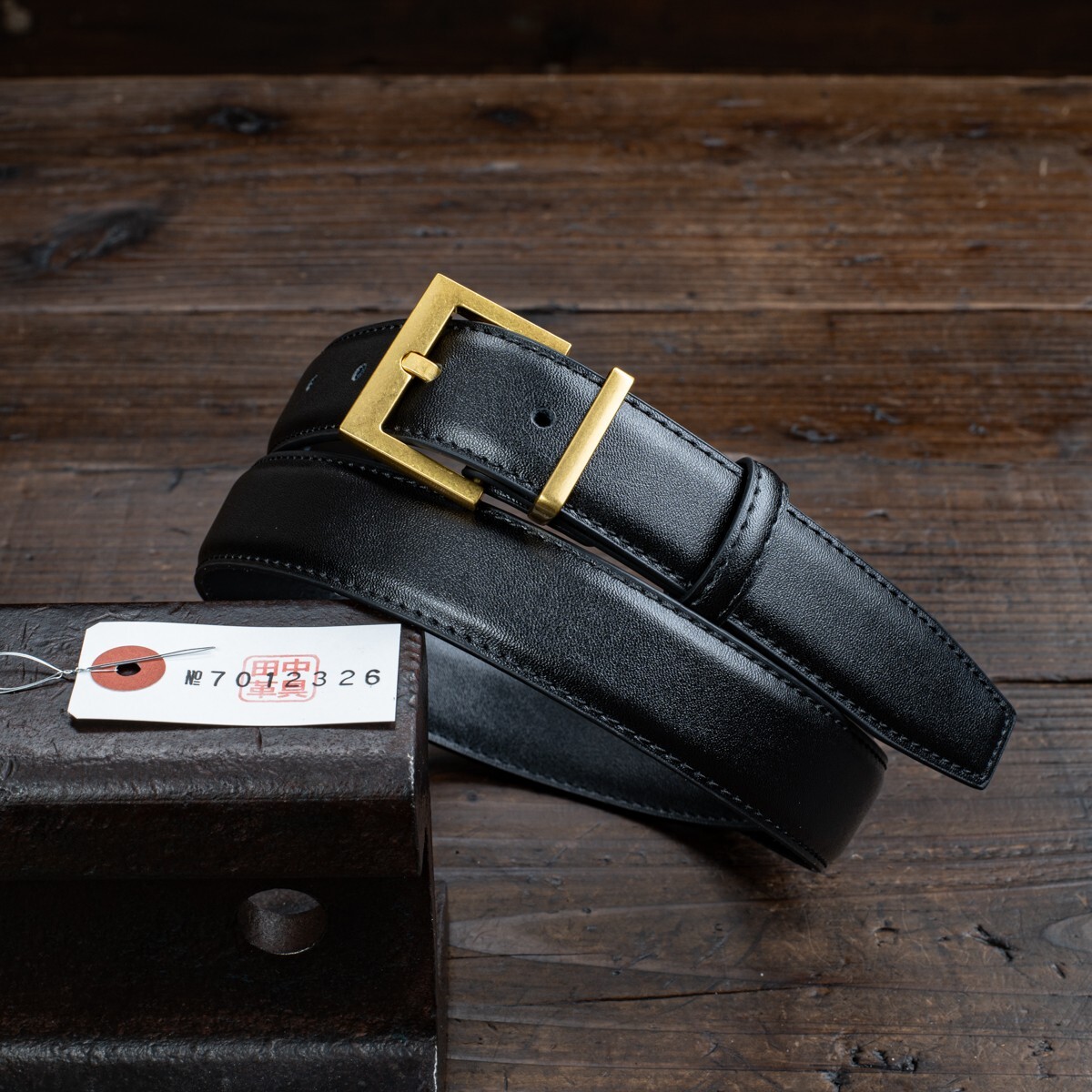 イタリアンレザーを使った細身のベルトです。革は両端をステッチでしっかりと留め、立体感を出しています。表面には細かなシボがあり、自然な光沢が高級感を引き立てています。腰に巻いたときにはしなやかさが感じられ、柔らかな着け心地です。