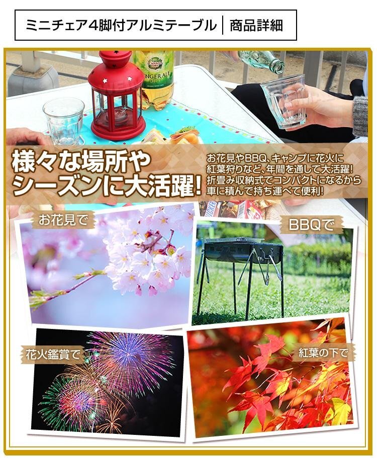 | アルミ製 折りたたみ式 アルミレジャーテーブル 横幅120×奥行60 2つ折り収納 高さ3段階調整 55/62/70cm イス付き カラー一覧 | |