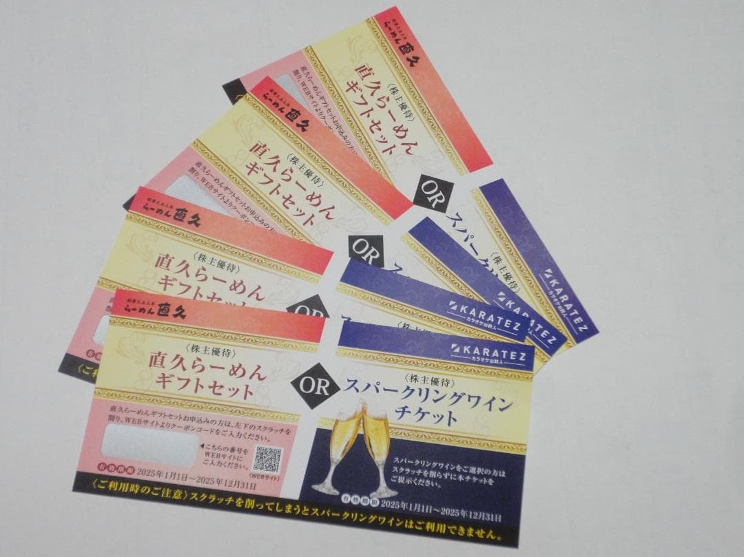 鉄人化計画株主優待 スパークリングワインチケット 4枚 有効期限は、2025年12月31日まで。 直久らーめんギフトセットはご選択いただけませんのでご注意ください。