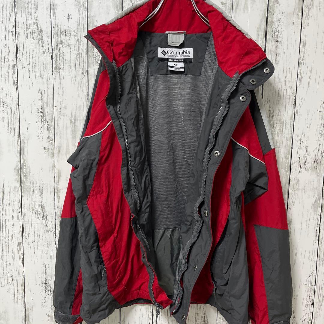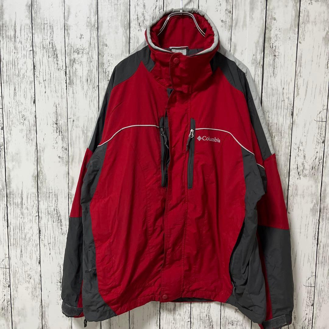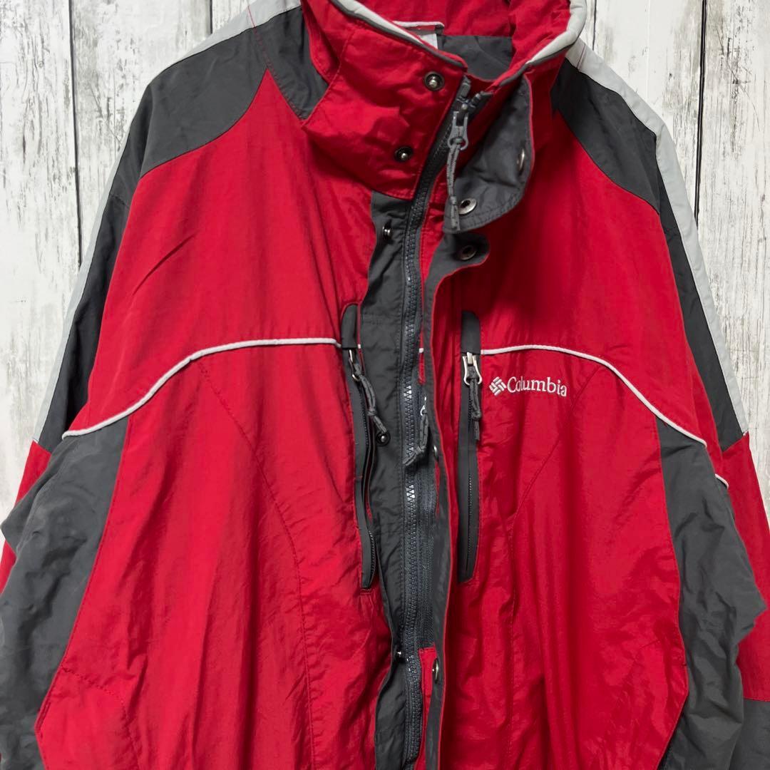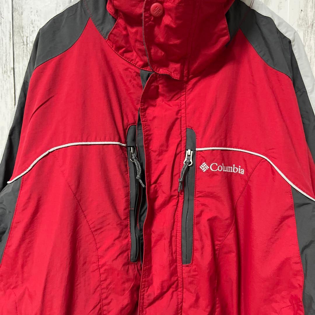 Columbiaのレッドとグレーのナイロンジャケット、ハイネックデザインで機能的。