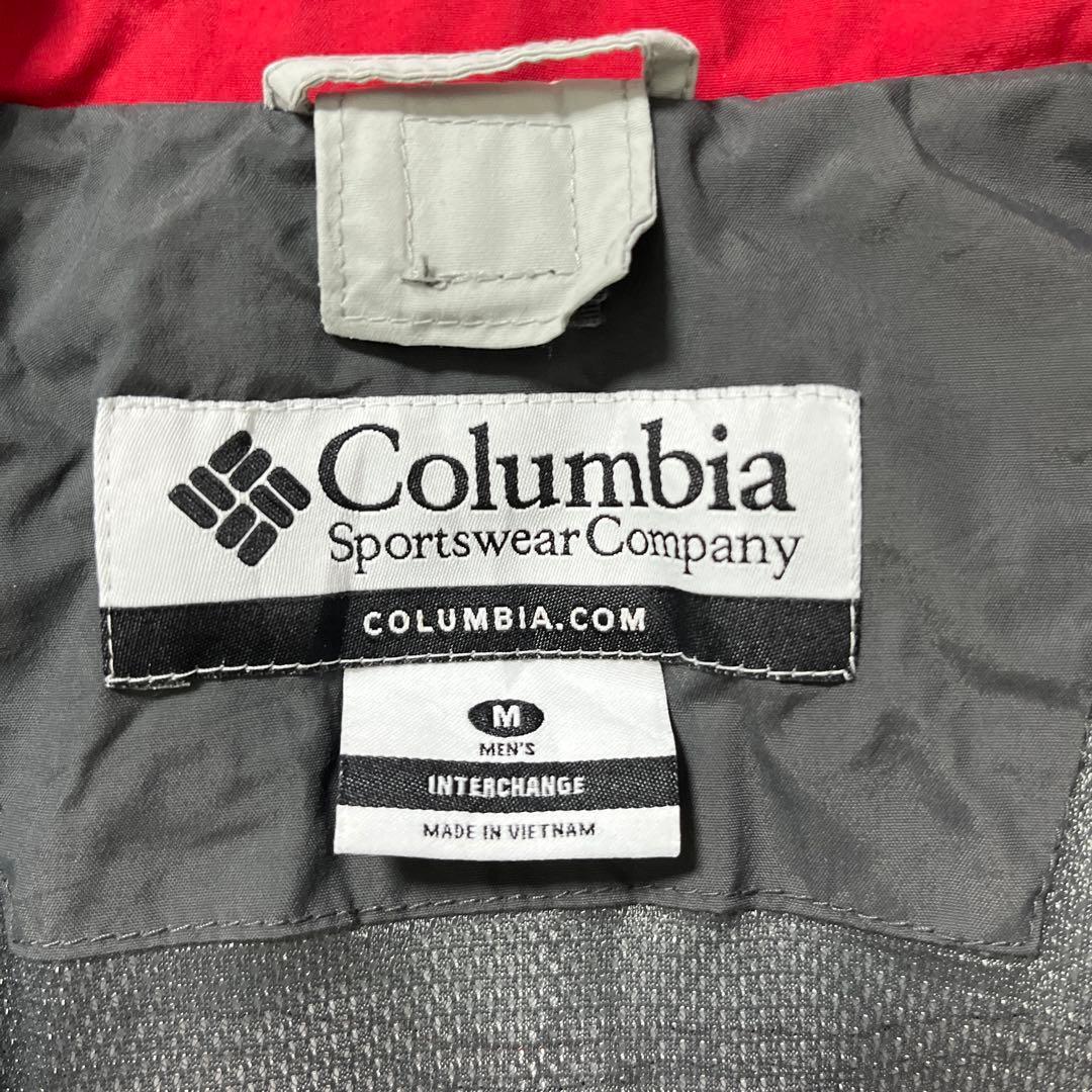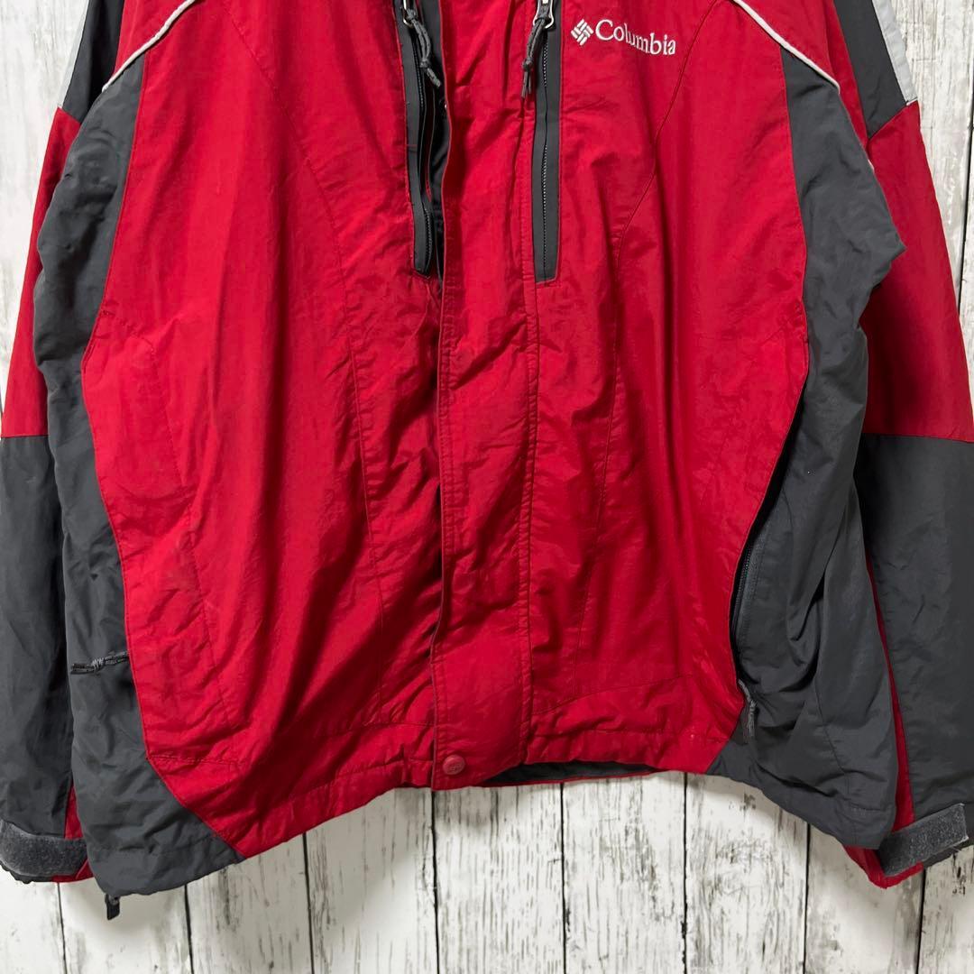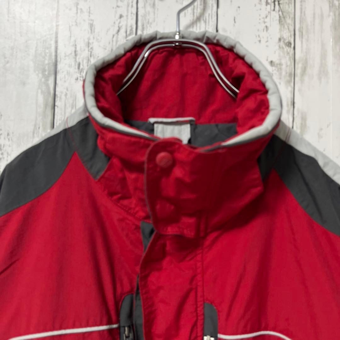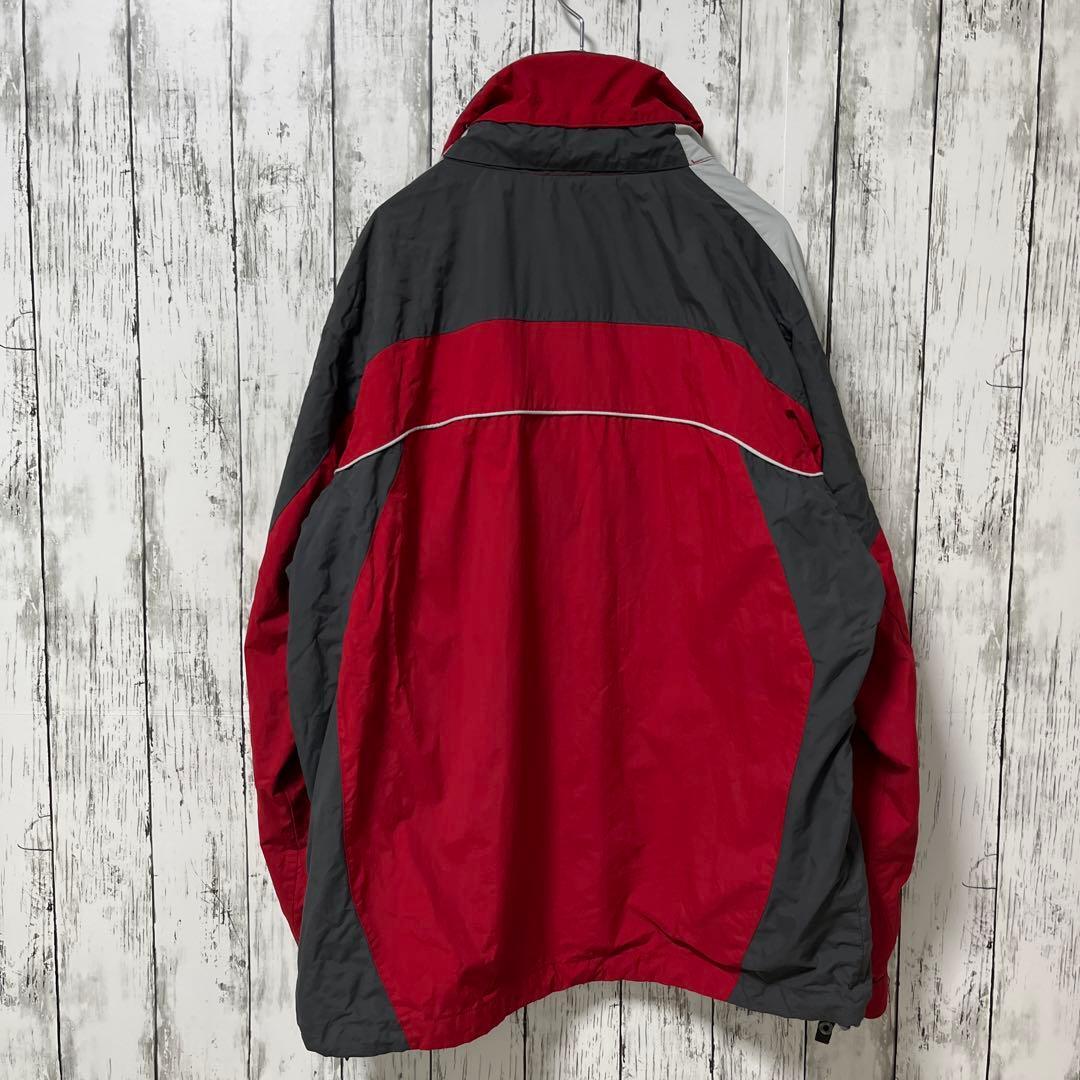 Columbiaのレッドとグレーのナイロンジャケット、ハイネックデザインで機能的。