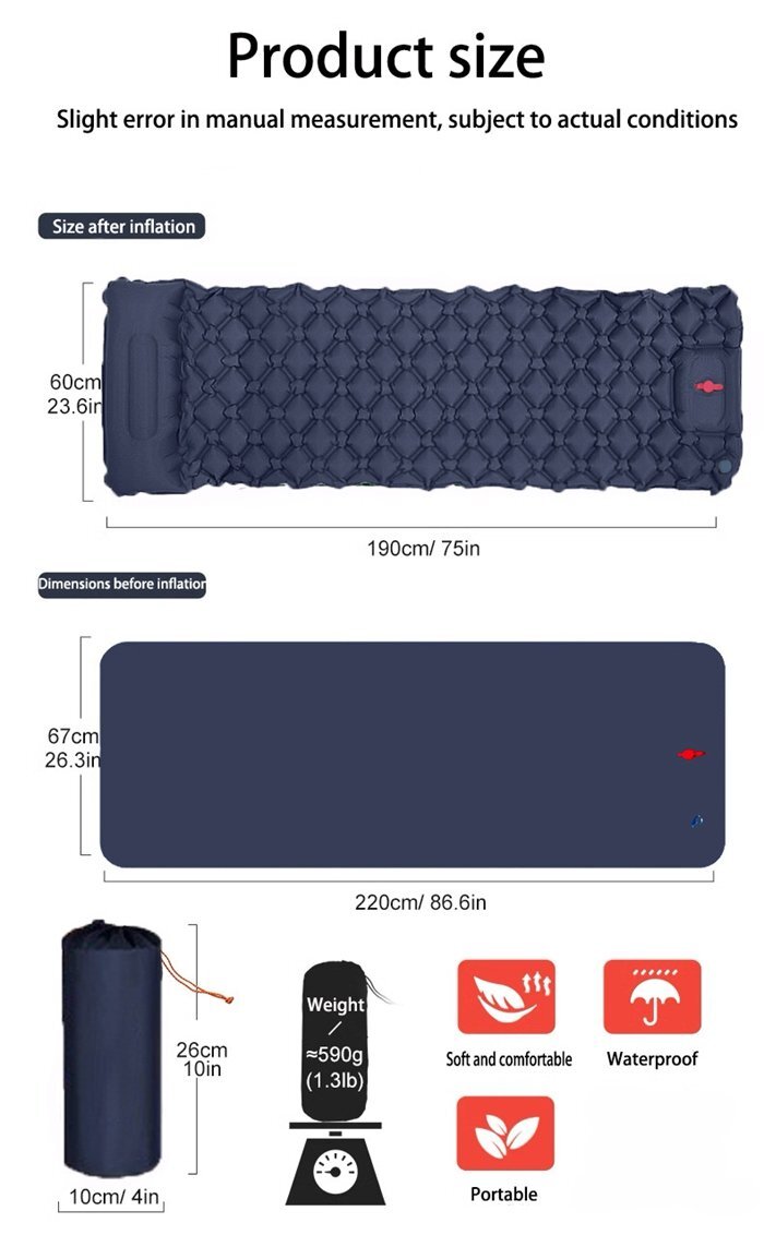 足部には足踏み式エアポンプが内蔵されており、電動エアポンプ、手動エアポンプ、吹き付けなどの従来の空気充填方式とは異なり、30~60秒でマットが完全に膨らみます。