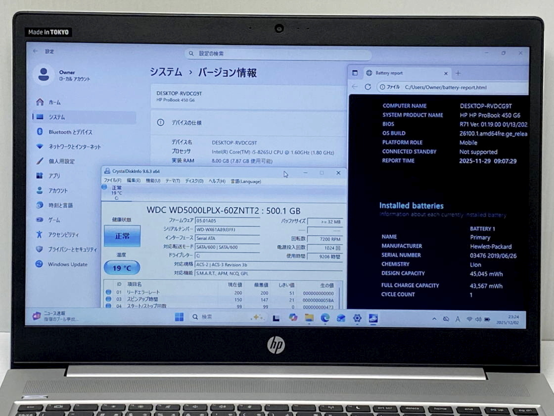 第8世代Core i5 HP ProBook 450 G6 Core i5 8265U 1.6GHz/8GB HDD500GB/WiFi/15.6HD/WebCam/WIN11 |