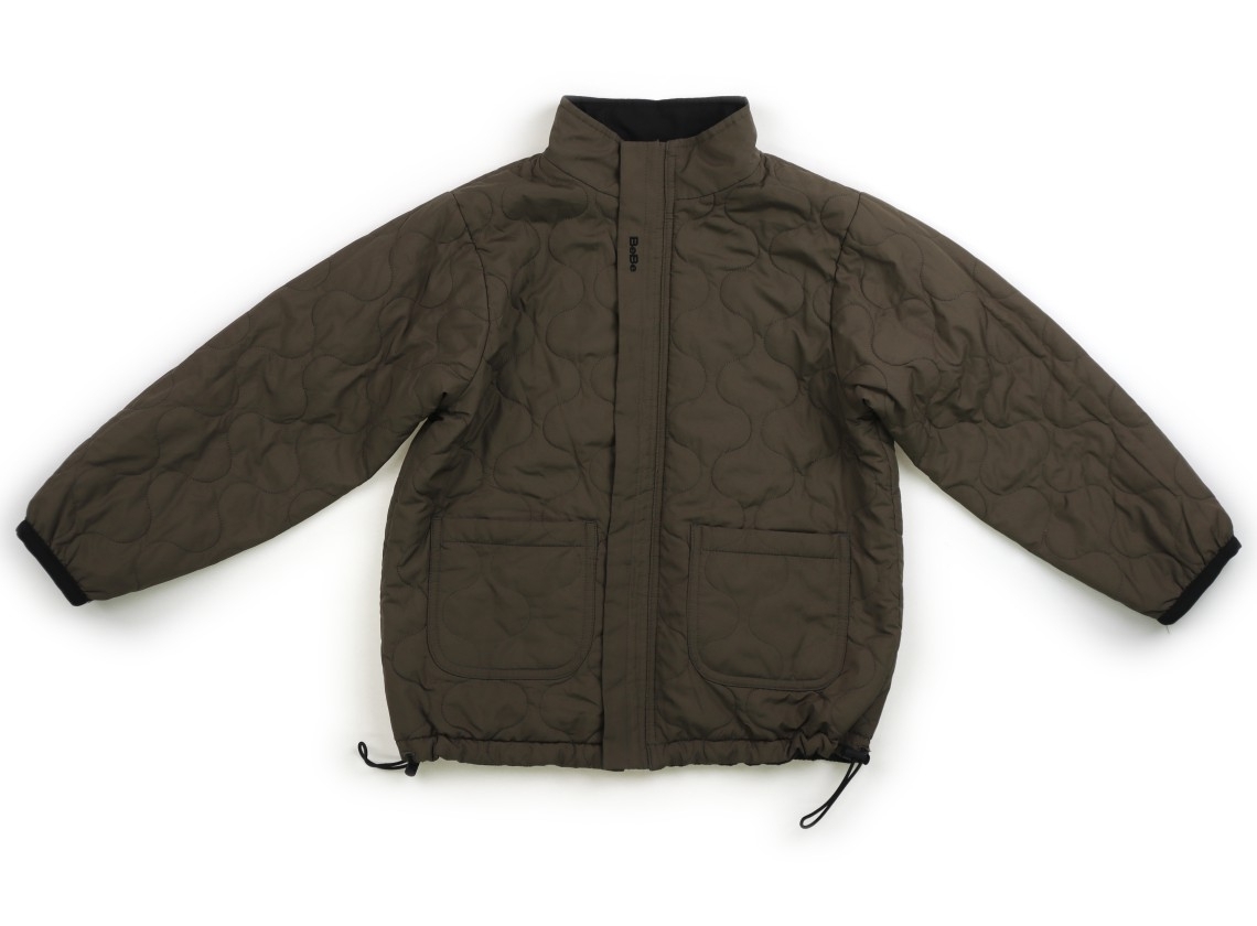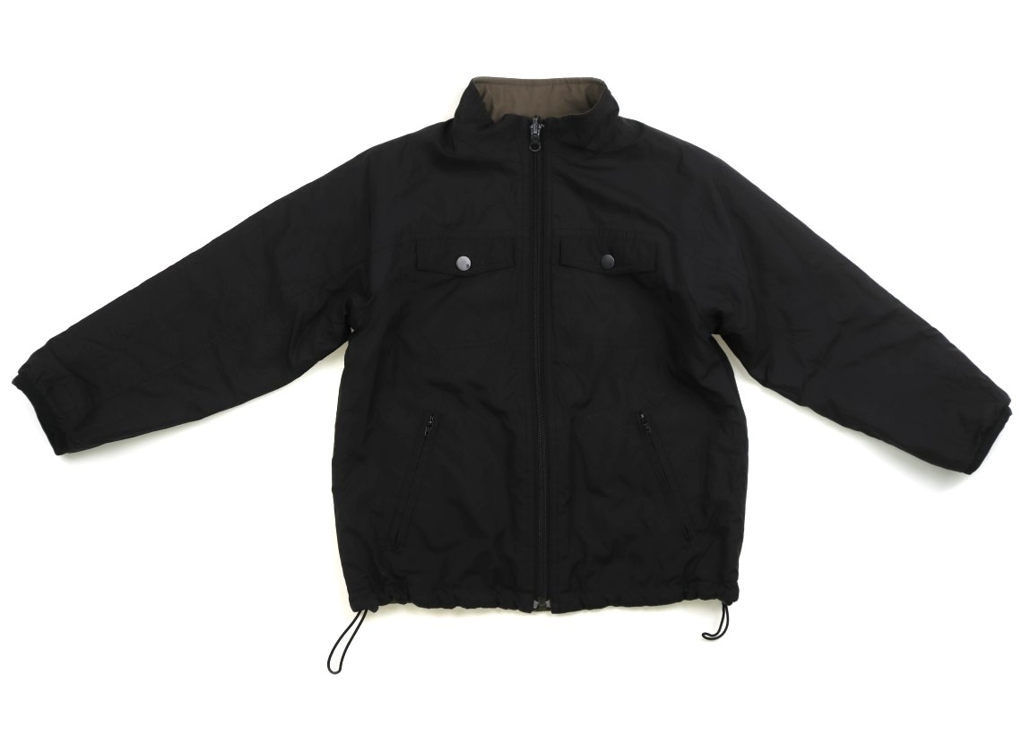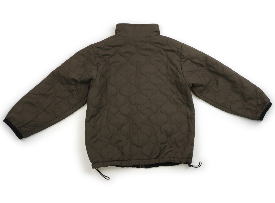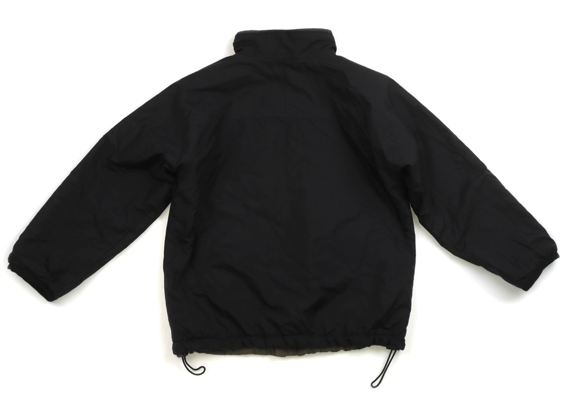 ポリエステル素材。中綿入り。リバーシブル仕様。ファスナー金具に剥げあり。黒側の身後袖とカーキ側の裾に1-2mmほどの穴があります。薄い汚れがいくつか見られます。