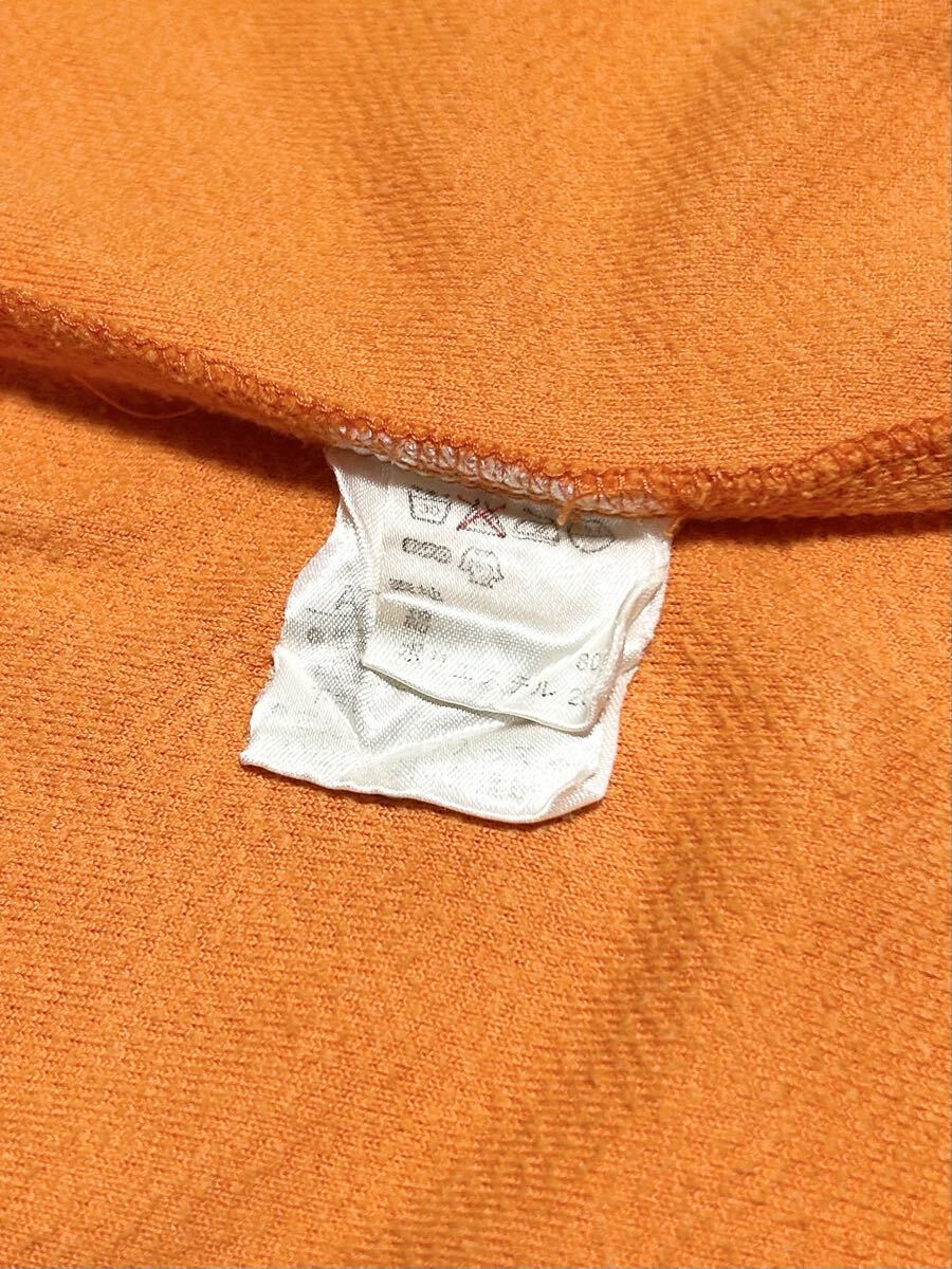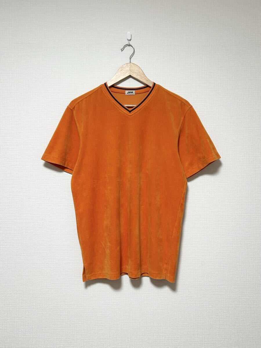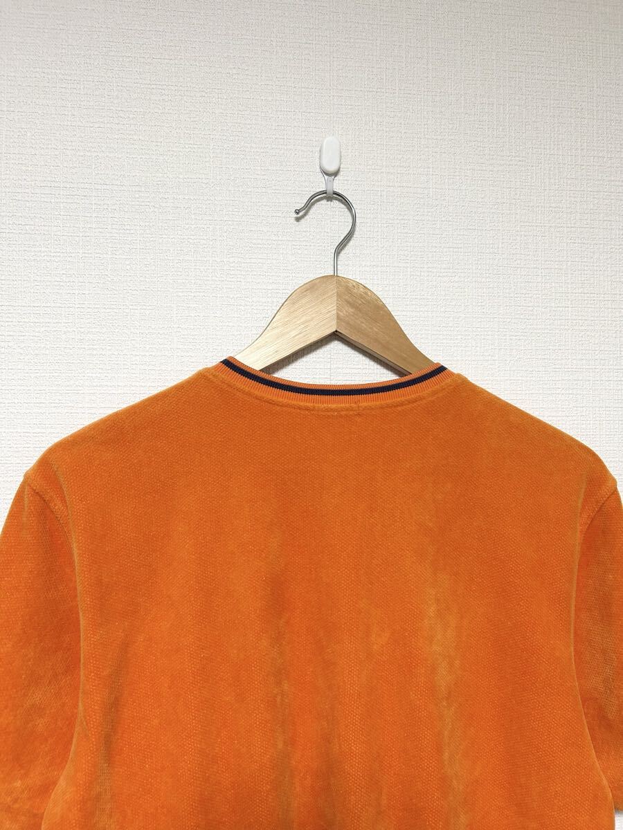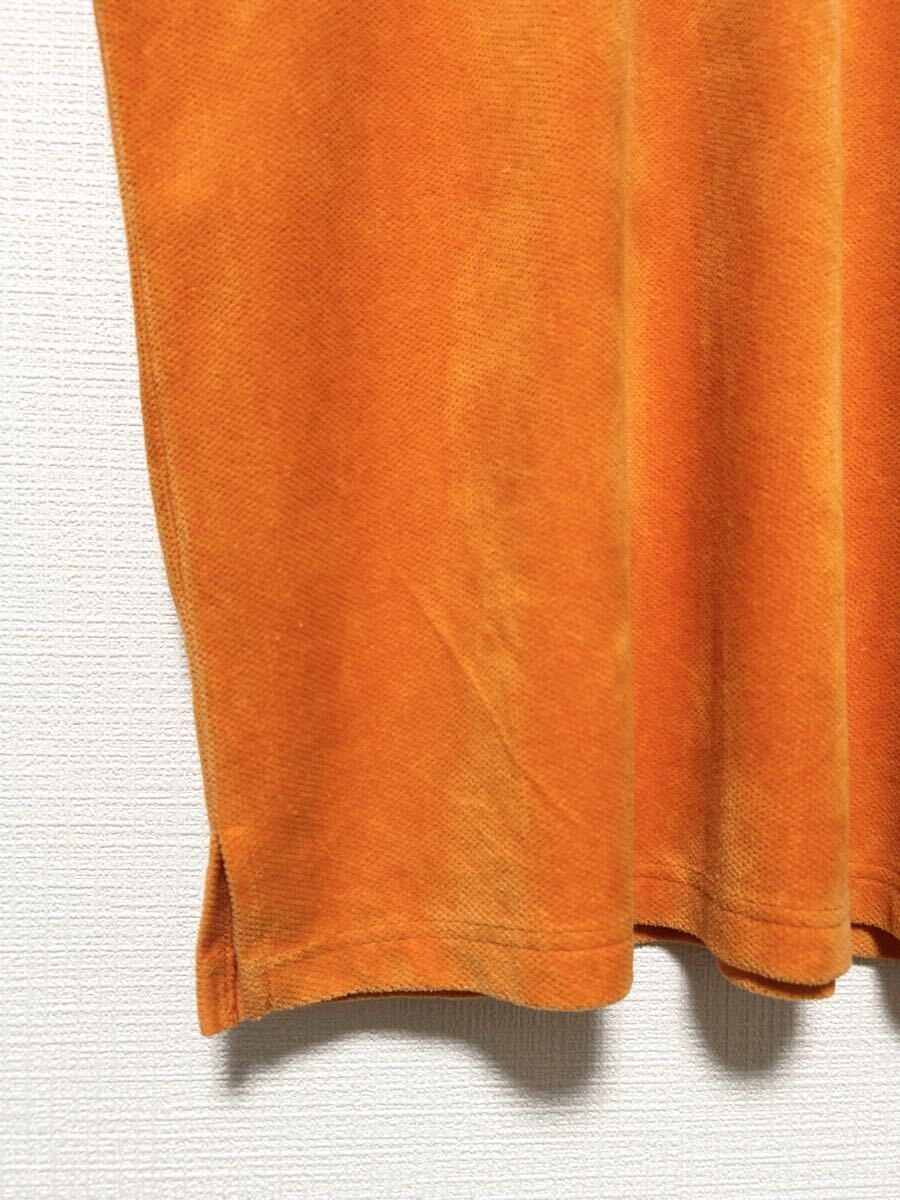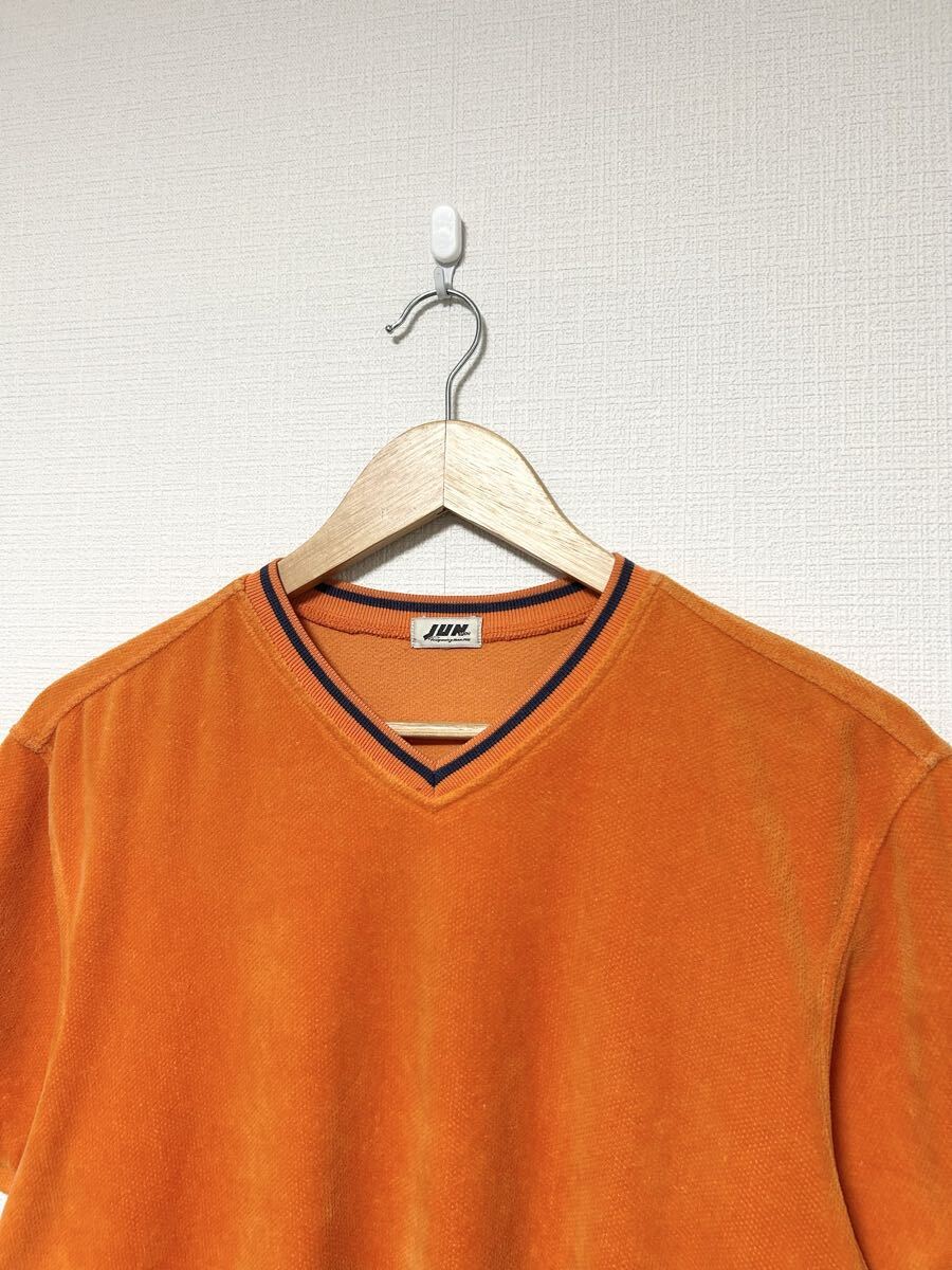 毛足の短いパイル地のカットソーです。やや光沢感のある生地感です。襟はネイビーのラインが入ったVネックになっています。裾の両サイドにスリット入ってます。